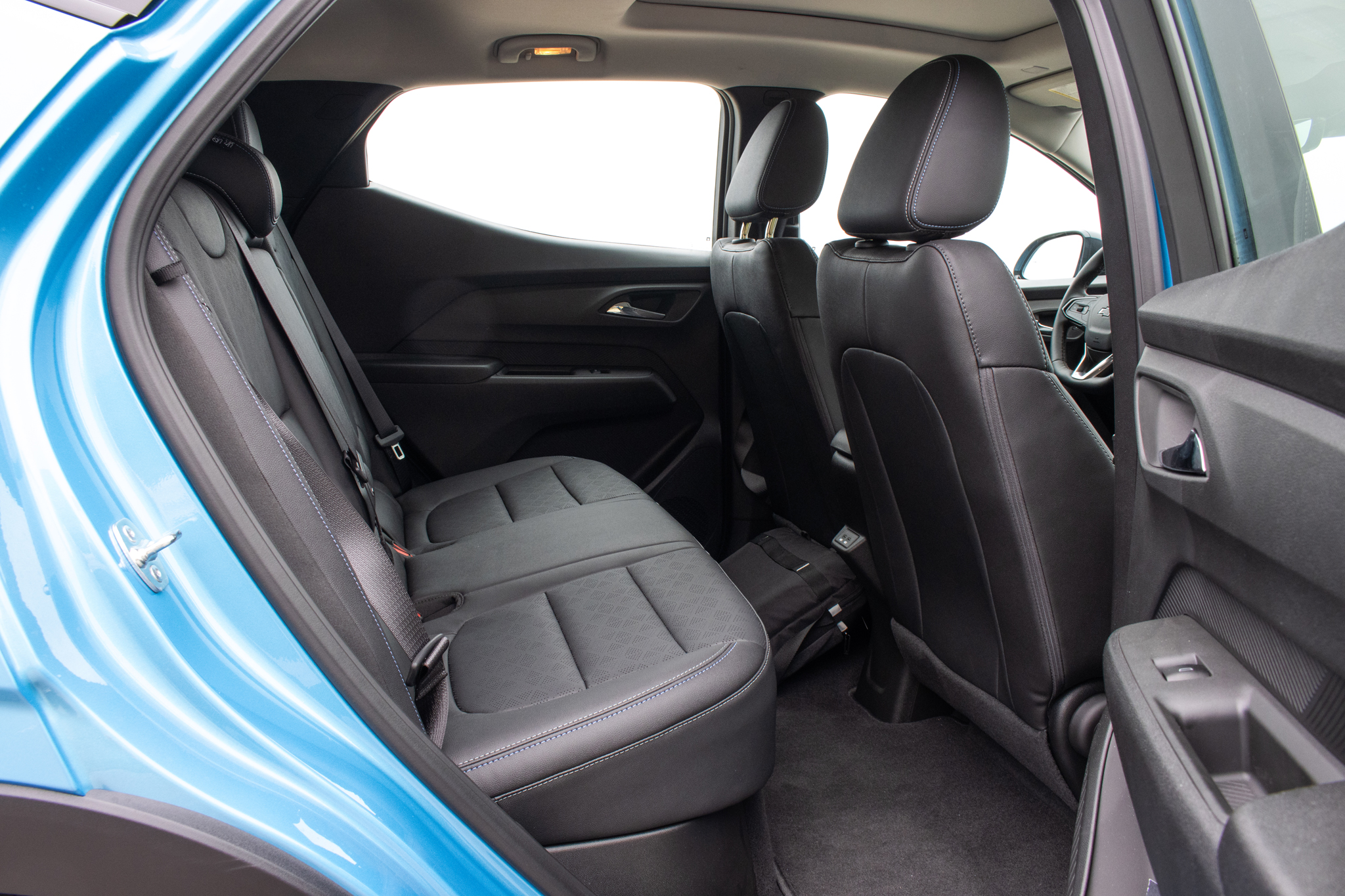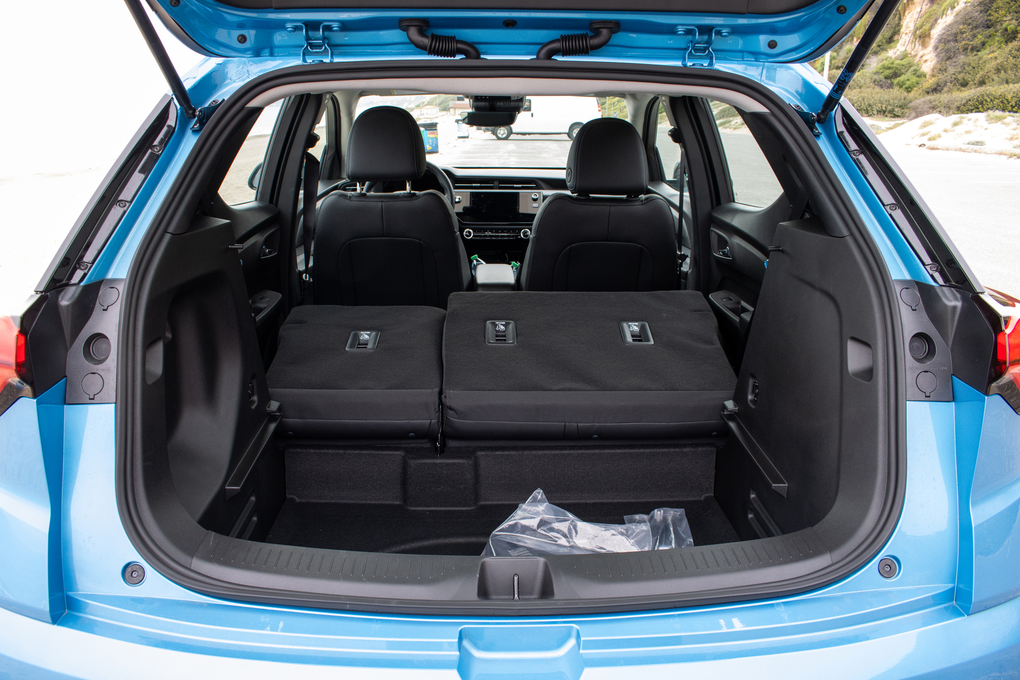 This is kind of a weird review because again, the 2027 Bolt is physically almost the same as the 2023 Bolt EUV. It occupies the same 169.9-inch by 69.7-in footprint, about a foot shorter in length than a Toyota Corolla. Its 96.6-cubic-foot cabin—a bit more than a Toyota Corolla Cross—still has a ton of space for junk even with the rear seats up, thanks to a deep hidey-hole under the cargo bay’s removable floor. There’s no frunk, but it doesn’t need one. The only physical difference from the outside is an updated front fascia with new headlights.