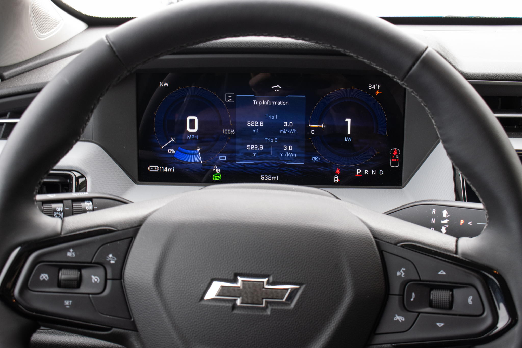 That screen is part of an updated interior that looks a bit nicer and pretty similar overall, minus a few buttons (sigh) and Apple CarPlay/Android Auto support (bigger sigh), but plus a convenient wireless phone charger/junk tray underneath the dash. Of particular interest to weirdos like me is that GM finally removed the steering wheel mounted paddle to activate the regenerative brakes. I always liked it because it felt sort of like a handbrake on a motorcycle and added a weirdly fun dimension to the driving experience. When I asked the engineering team about it, they told me it only existed in the first place because they hadn’t perfected blending regen and friction brakes through the pedal, and they needed that paddle to get the car to its EPA-rated range. Market research showed most people only ever used it to cancel the cruise control, and they’ve optimized using the pedal to plow energy back into the battery, so they decided to pull it. Don’t cry because it’s over, smile because it happened.