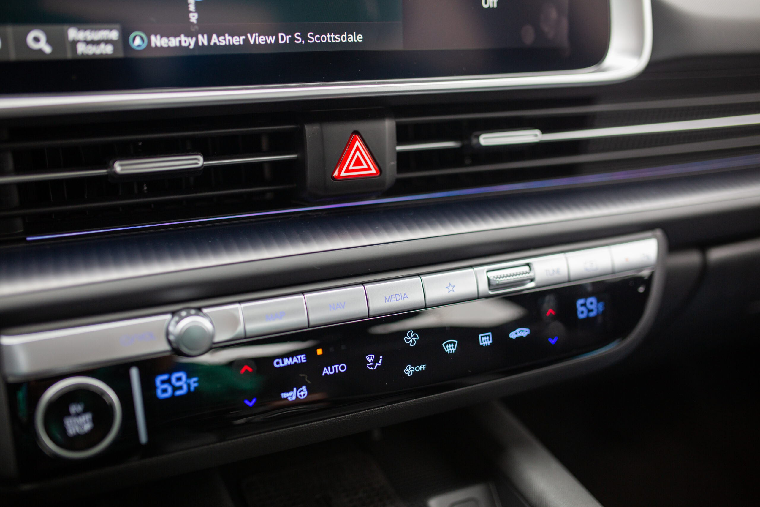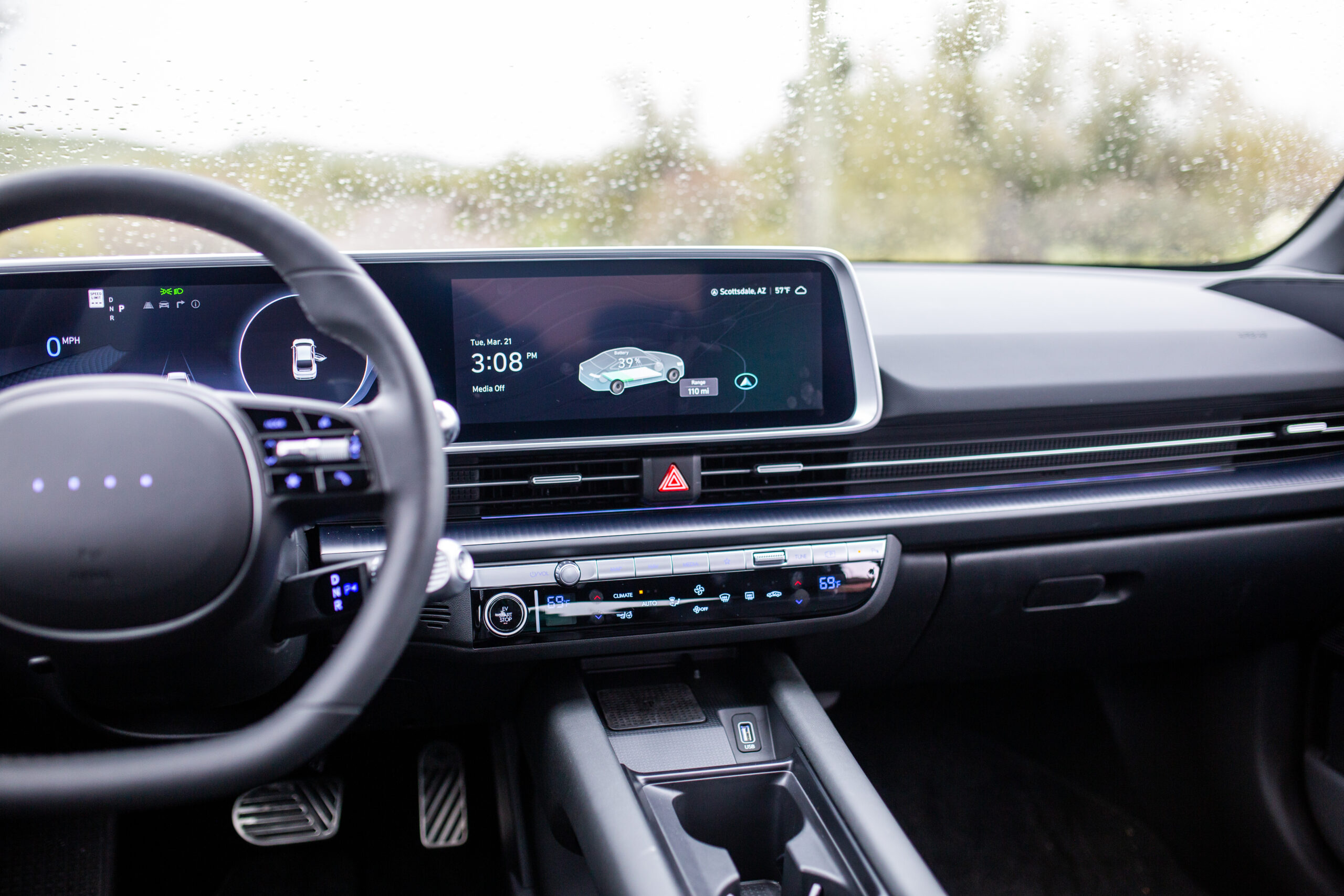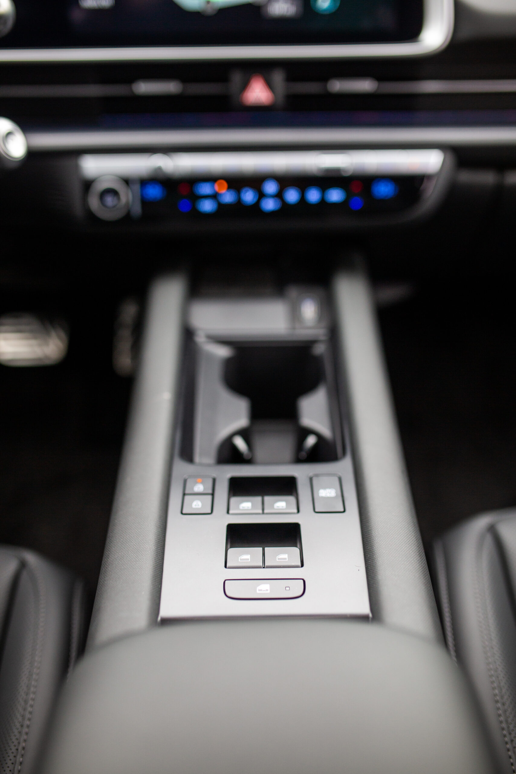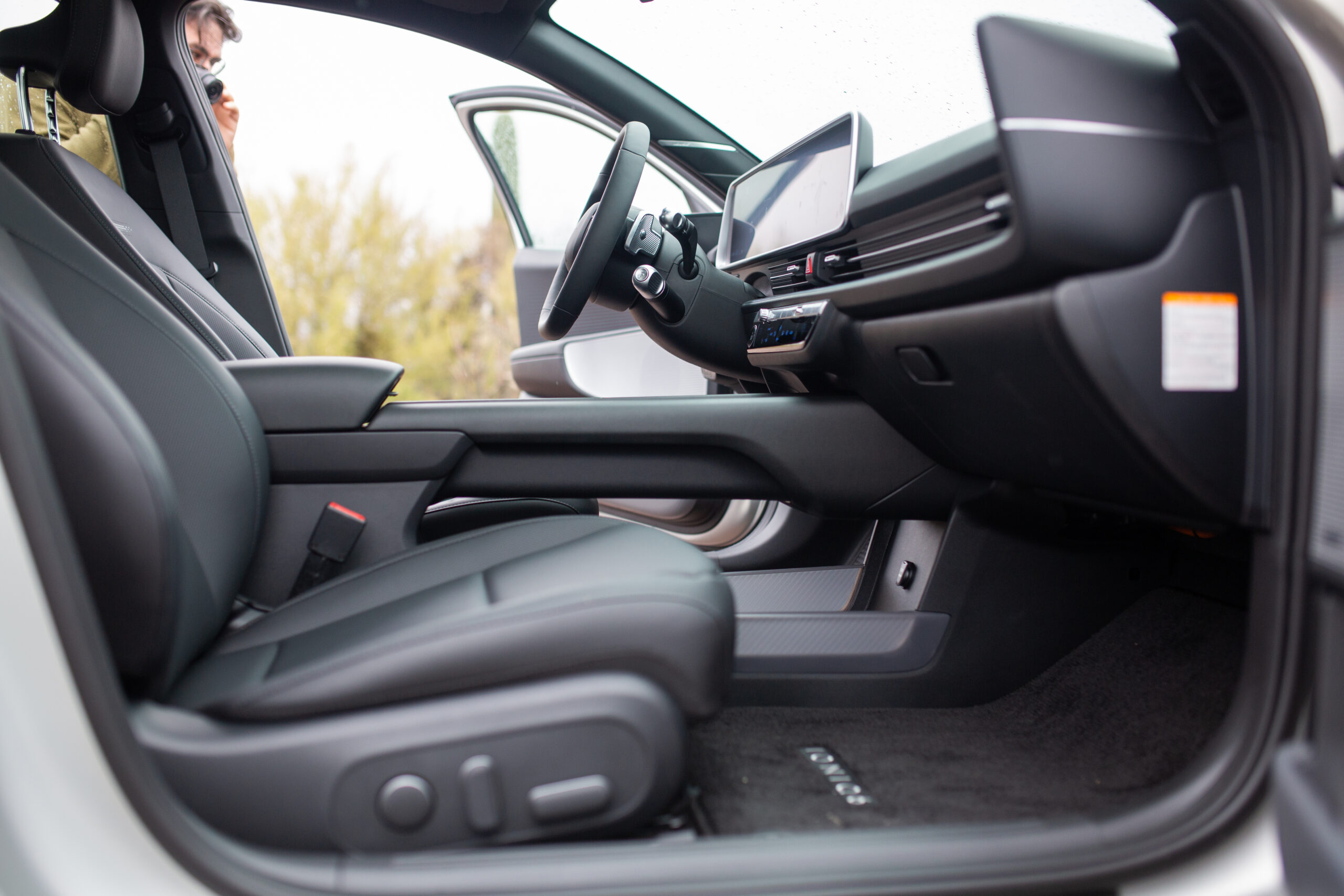 Inside, it gets even more design-y and cool. Largely owing to its engine-and-transmission-less EV packaging, the interior is palatial. Knee room felt endless, legroom in the front seat allowed for a full leg stretch while still allowing rear passengers to have ample room. The cabin feels more spacious than some full-size trucks I’ve been in. Vertically, however, things become surprisingly challenging. Even for my five-foot-nine frame, there wasn’t much extra space above my head in the front seat, and I was right at the limit in the rear seat. Hyundai says the inspiration for the rear seat is a couch, so tall people should get ready to slouch a bit and sink in. It’s the only real miss in the interior, but it is a fairly serious one.