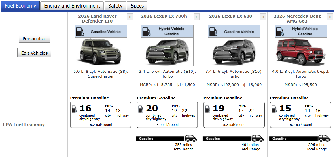 The downside to a V8, of course, is fuel consumption. The Defender 110 V8 is no outlier. It’s rated at 14 mpg city, 18 mpg city, and 16 mpg combined. We included both the LS600 and the 700h hybrid in the above to demonstrate that while a hybrid system certainly helps around town, the V8 hurts just as much on the highway.