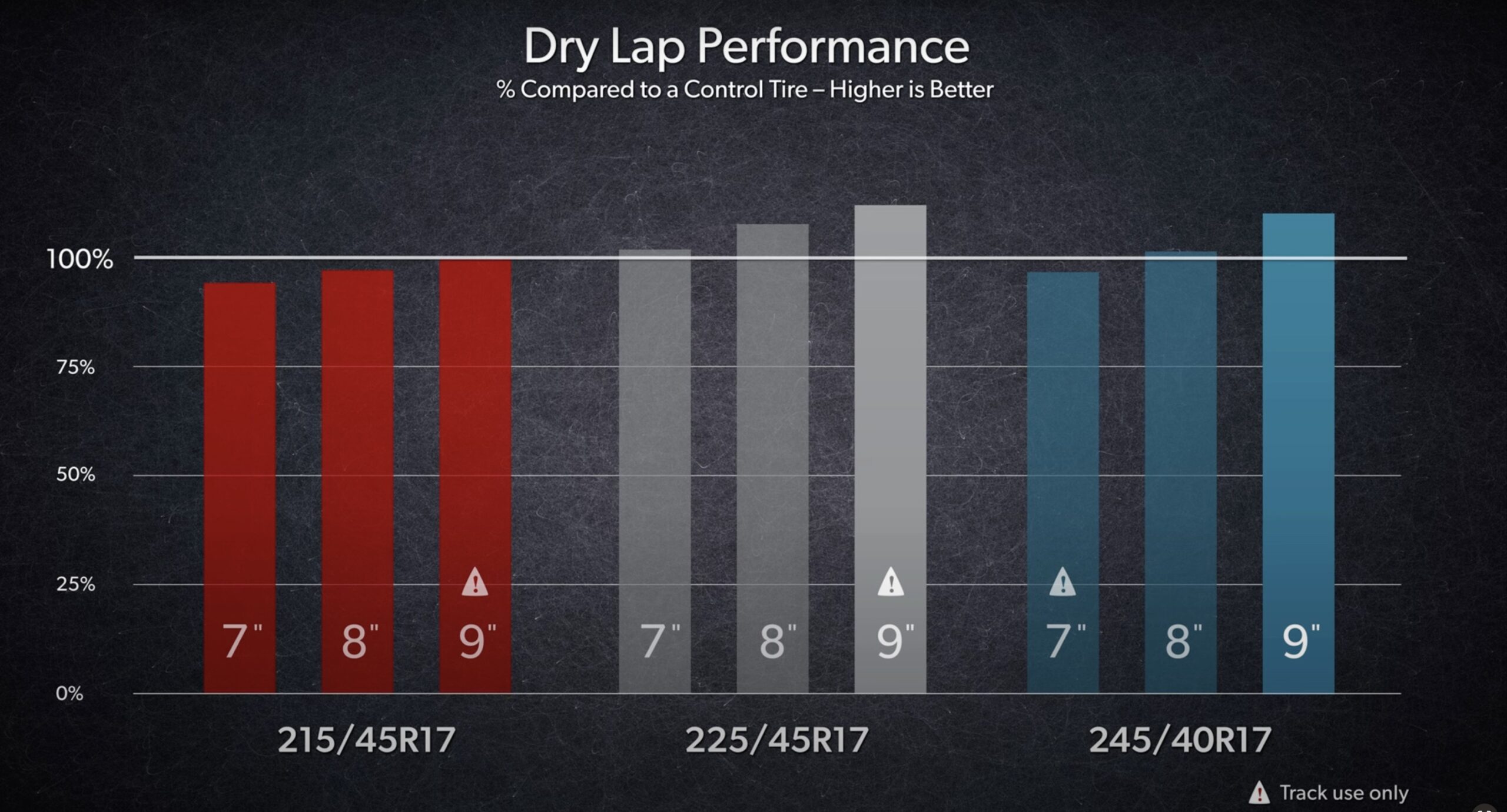 In the wet, almost the inverse was true. The 245s were much slower in the wet, and the 215s universally shined. The 215s on 17×8 wheels was the quickest of the group, and none of the 245s beat the control time.