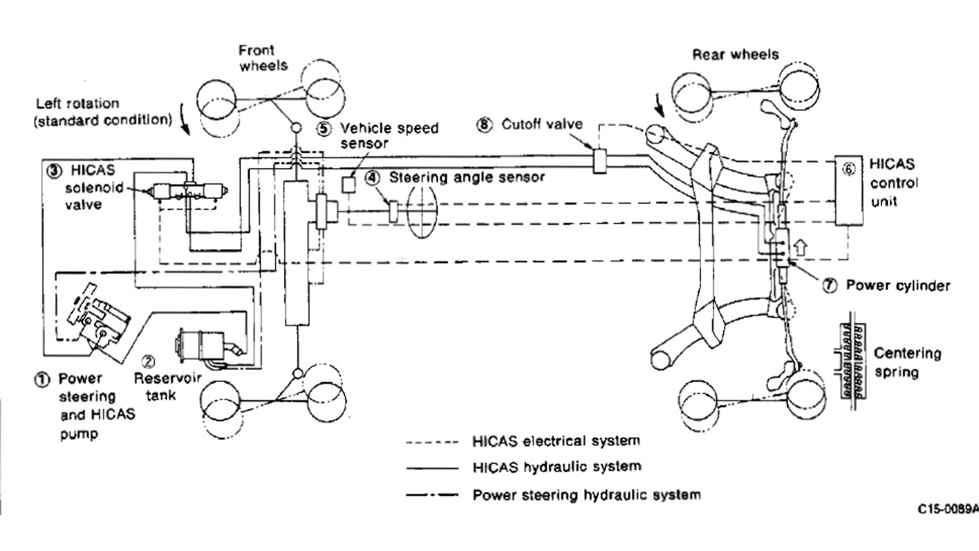 “Earlier HICAS versions used hydraulics to steer the rear wheels. The hydraulic system was powered by the power-steering pump and used speed sensors to determine how much and in which direction to steer the rear wheels. Later versions, called Super HICAS, moved to an electric actuator for the rear steering rack, making the system much lighter. The Super HICAS uses input from a speed sensor and steering-wheel-angle sensor through the system’s HICAS computer to determine how quickly you’re entering a turn and adjusts the angle of the rear wheels to match the driving conditions. HICAS and Super HICAS rear-wheel steering is limited to about one degree in either direction.”