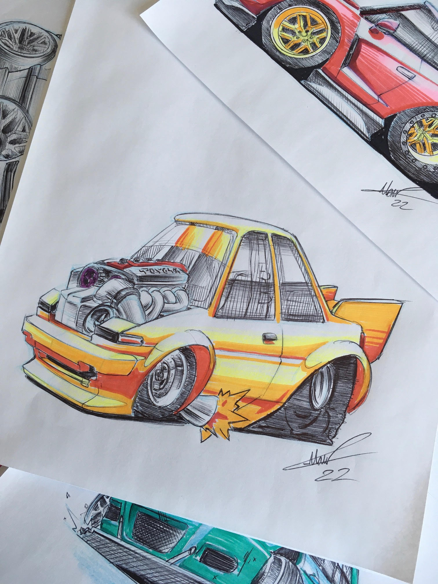 Fernandez has been designing these character cars for about five years now. On Instagram, he started doing a “who’s that Pokémon?” type of a game where people would guess what kind of car he’d drawn. Separately and as a Formula Drift fan, he started out by sketching drivers’ cars as fan art and getting them to sign his sketchbooks. Eventually, those two ideas merged into him wanting to create something more memorable, playable, and collectible. A card set that people could collect. Thus was born Chicane, the trading card game.