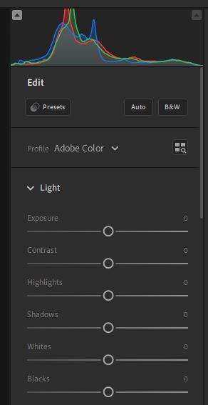 Before we begin to edit, we need to understand what a histogram is. In Lightroom, it appears at the top of the edit panel as a small graph made of red, green, and blue lines. The histogram is a representation of all the colors and light levels in an image, and it’s fairly simple to read. The X axis is brightness: the left-hand side of the histogram is the darkest part of the photo, and the right-hand side of the histogram is the lightest part of the photo, with the mid-tones represented in the middle section. The Y axis is quantity: How many pixels in the photo are each corresponding level of brightness. Each different-colored line corresponds to red, green, and blue pixels in the photo.