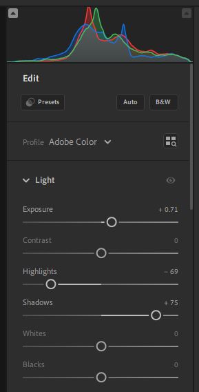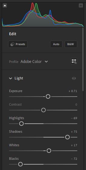 Instead, I want my picture to have most of its brightness in the middle section; that will give me the best base to edit from. To do this, I’ll up the exposure about .7 stops to compensate for the fact the original photo is a little underexposed. Then I’ll take the highlights and move them down to remove any “hot-spotting,” or points of overexposure, and raise the shadows to remove any lost detail in the dark areas of the photo.