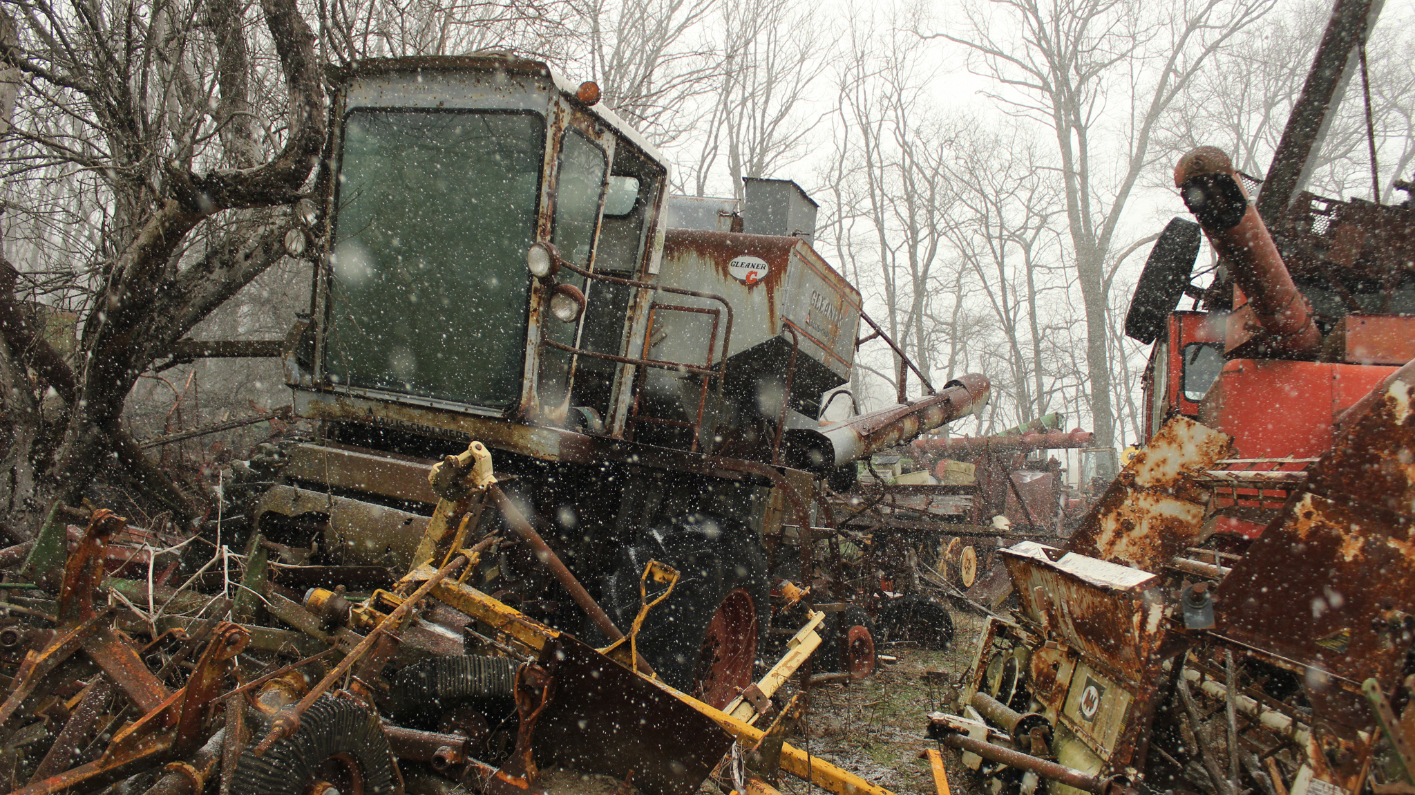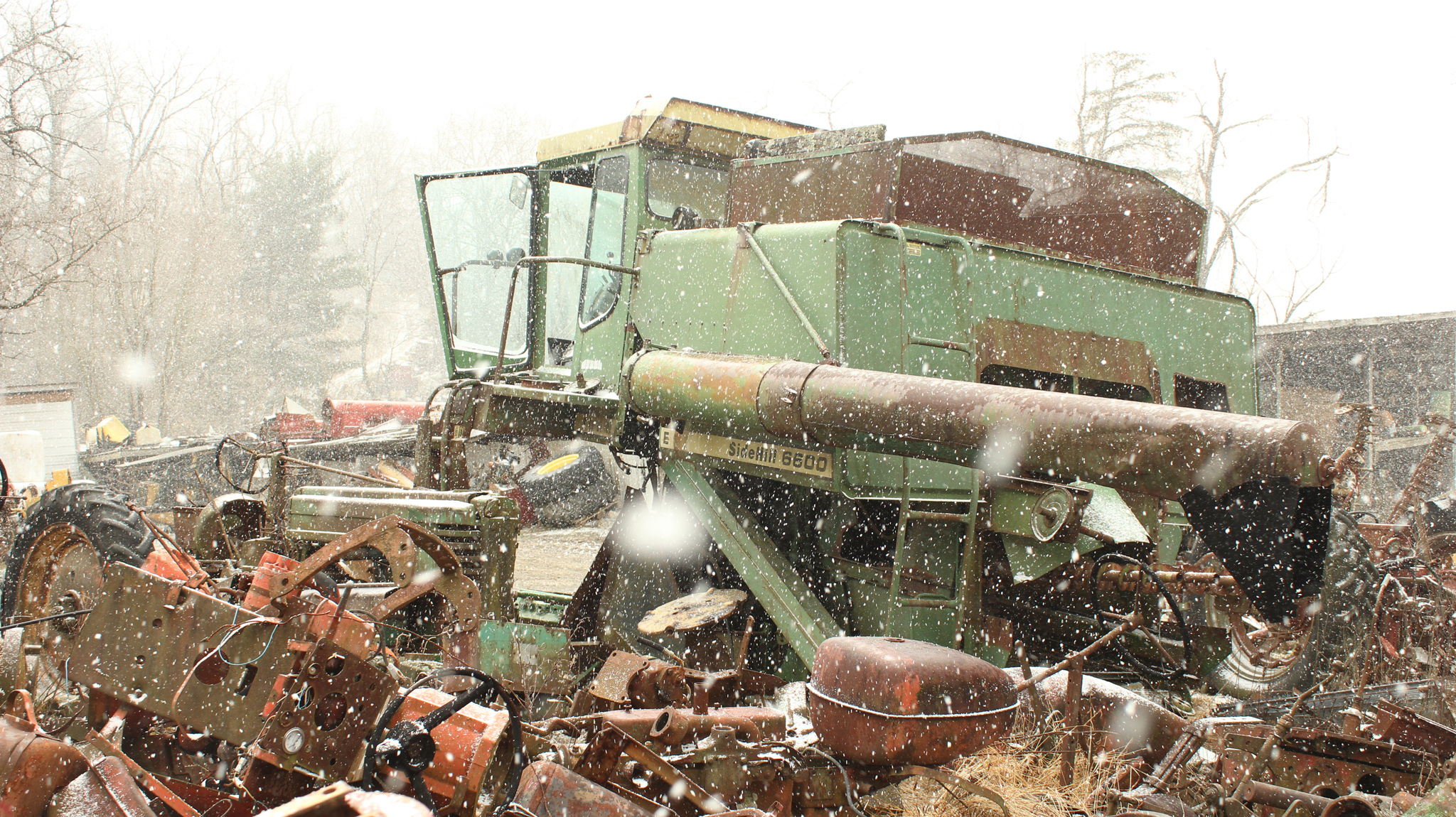 As I stood upon the hill, a giant snow squall swept across the valley. Suddenly, the clear sky gave way to a wall of white, and millions of hard tiny snowballs pelted me. My friend Alex and I took refuge under an old Gleaner combine, unaware of just how dangerous the storm had become. A thin layer soon coated the ground and the surrounding piles of metal. Perhaps I’d read too many books about anthropomorphic tractors as a kid, but in that moment I actually felt sorry for the equipment. The machines once built to tame Mother Nature were now slowly returning to her.
