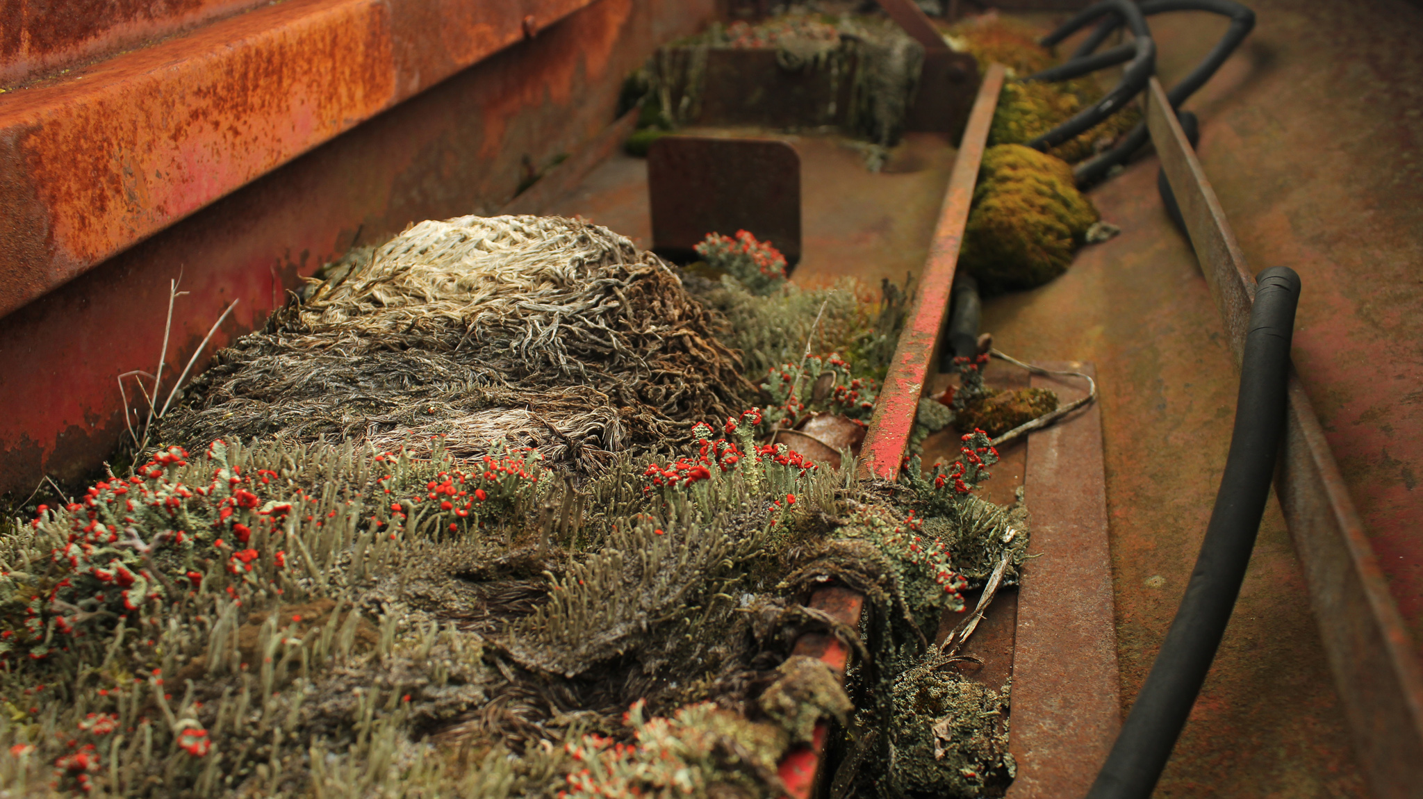 Yet, in the mess there was beauty. A tiny bird built its nest between a tree and power-take-off shaft. Colorful moss grew on the remains of rotting twine within an ancient hay baler. The smattering of faded paints added color to the dormant and barren landscape. The twisting, branching pathways reinforced the idea that this was all natural growth.