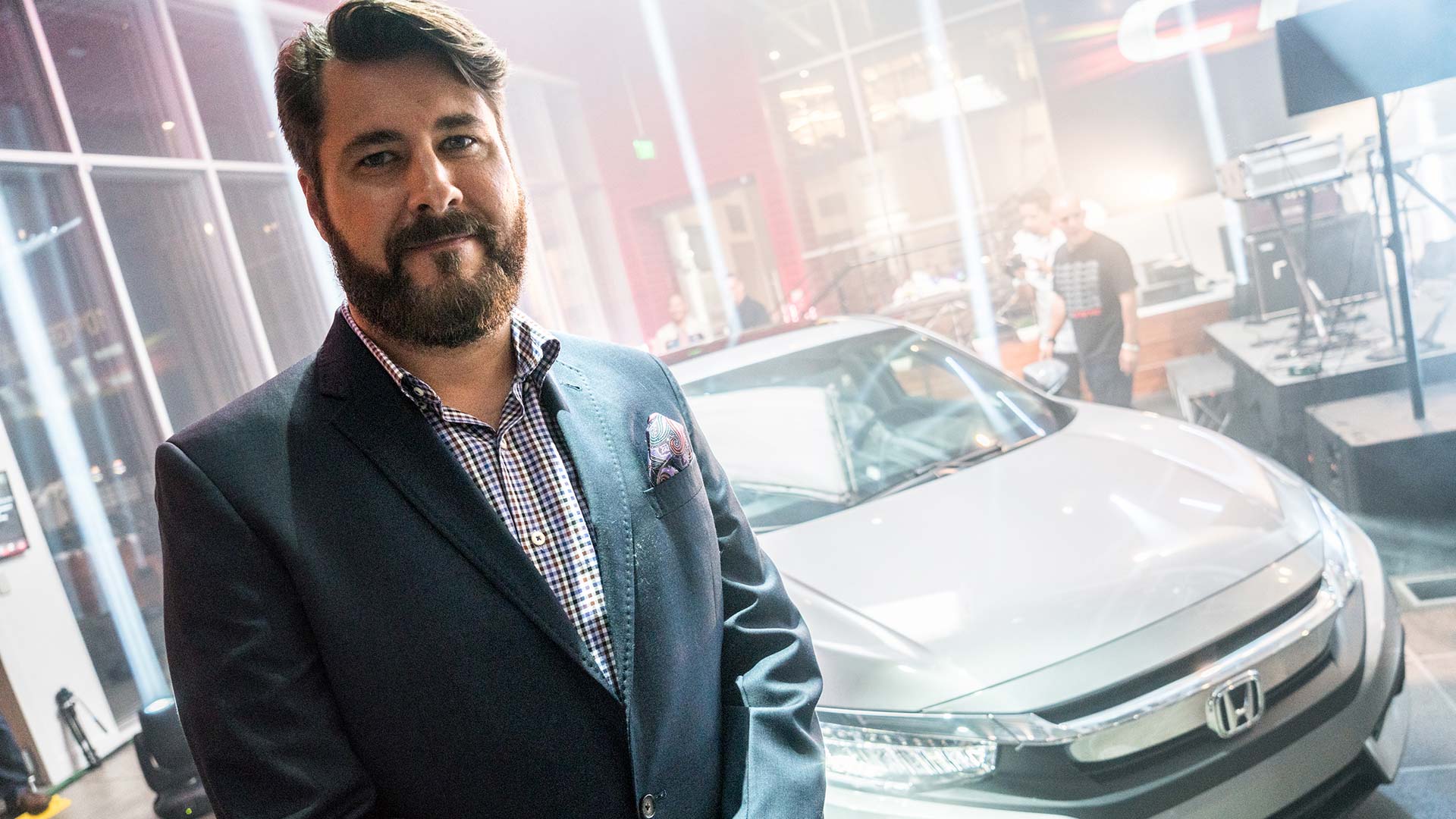 Jarad Hall starts sketching and tying ideas together the second he picks up a pen. Plaid and beardy, he’s like a tall Bob Villa, with the soothing narrative style of Bob Ross. Hall’s beaming a little through his whiskers. An hour after I meet him, the cover will come off the 2016 Honda Civic in front of fans and journalists and a live band, and all the rest of the world watching via YouTube. And because Hall is the Exterior Lead Designer, he’ll beam a little harder. Crisp lines, evocative openings. Larger and more luxurious too. It’s a bold, up-market design for the Civic. By the numbers, this is the most important new car we’ll see all year. And unlike the outgoing ninth-generation car, Hall’s vision for the 2016 Civic doesn’t have any eye toward gentle evolution. Or subtlety. Here’s the story behind that shape, in his words.