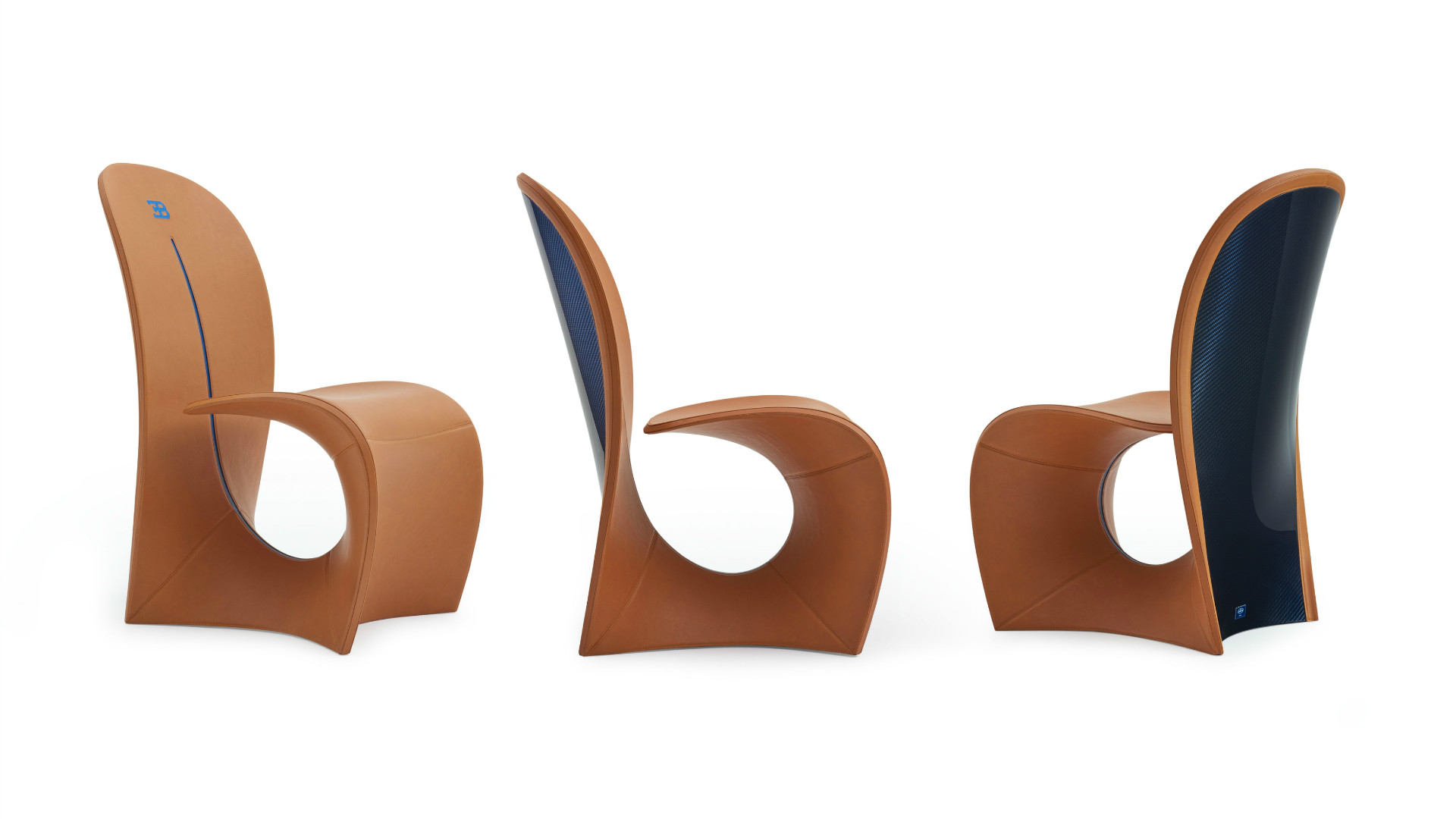 That’s the Royale sofa, inspired by the 1927 Type 41, the luxury behemoth built to throw shade at Rolls-Royce. There’s also the art deco Atlantic coffee table, a carbon fiber and metal structure, the top of which has an ultraviolet blueprint of the landmark 1936 Type 57SC. But the crown jewel of the collection is this, the reimagined Cobra chair: