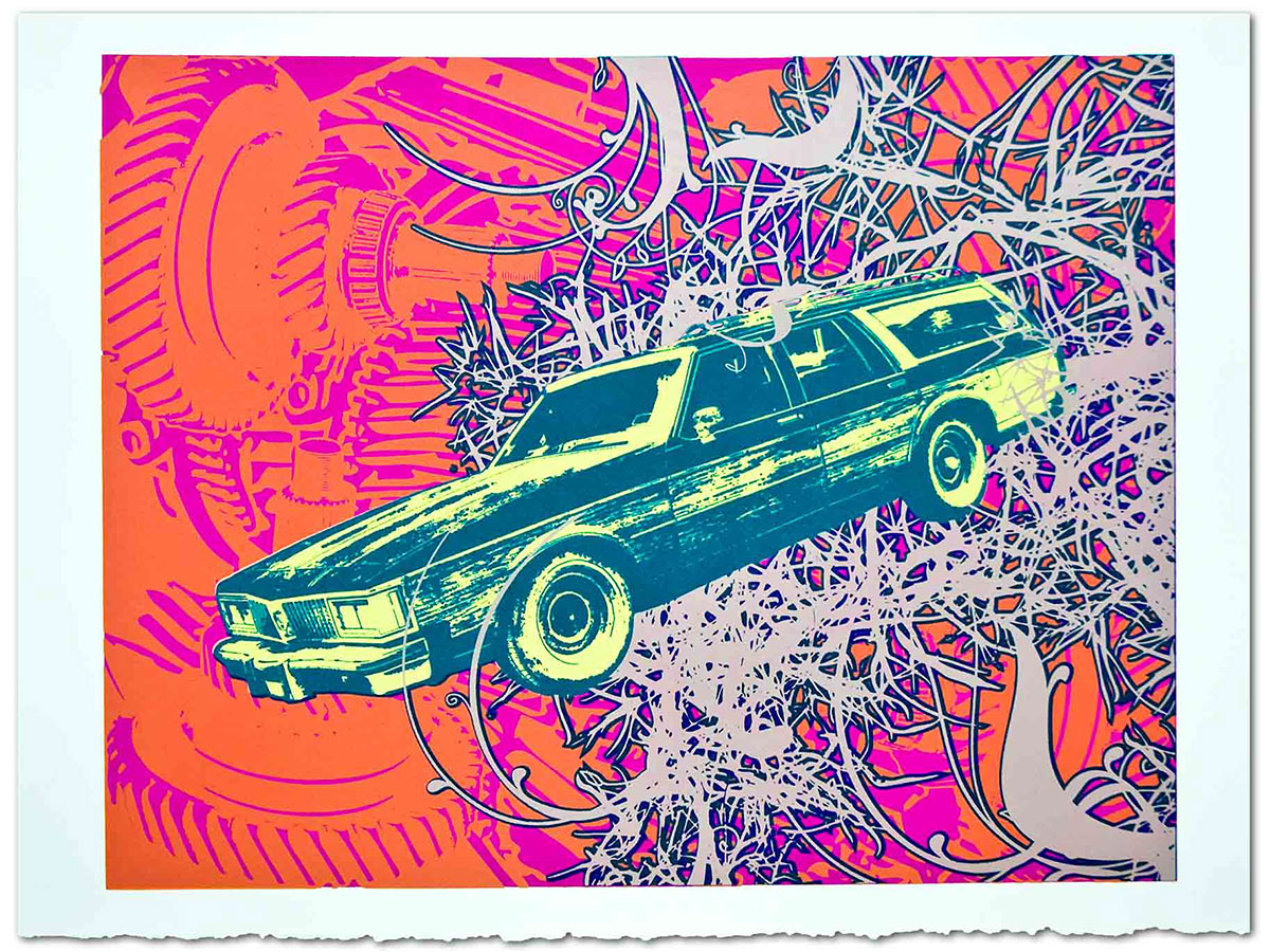 This idea of the reclaiming of the mechanical by the natural became the foundation for an ongoing series of silkscreen prints and panels—titled Machine Overdrive—that Keller recently completed. The work is based on photos of a dozen obscure vehicles shot on the streets of New York, at a rate of one per month, over the course of a year. A vintage Land Rover, a VW Fastback, an Alfa GTV6, a Jeep Grand Wagoneer, a customized Dodge Van, a Rolls-Royce Silver Shadow all make appearances.