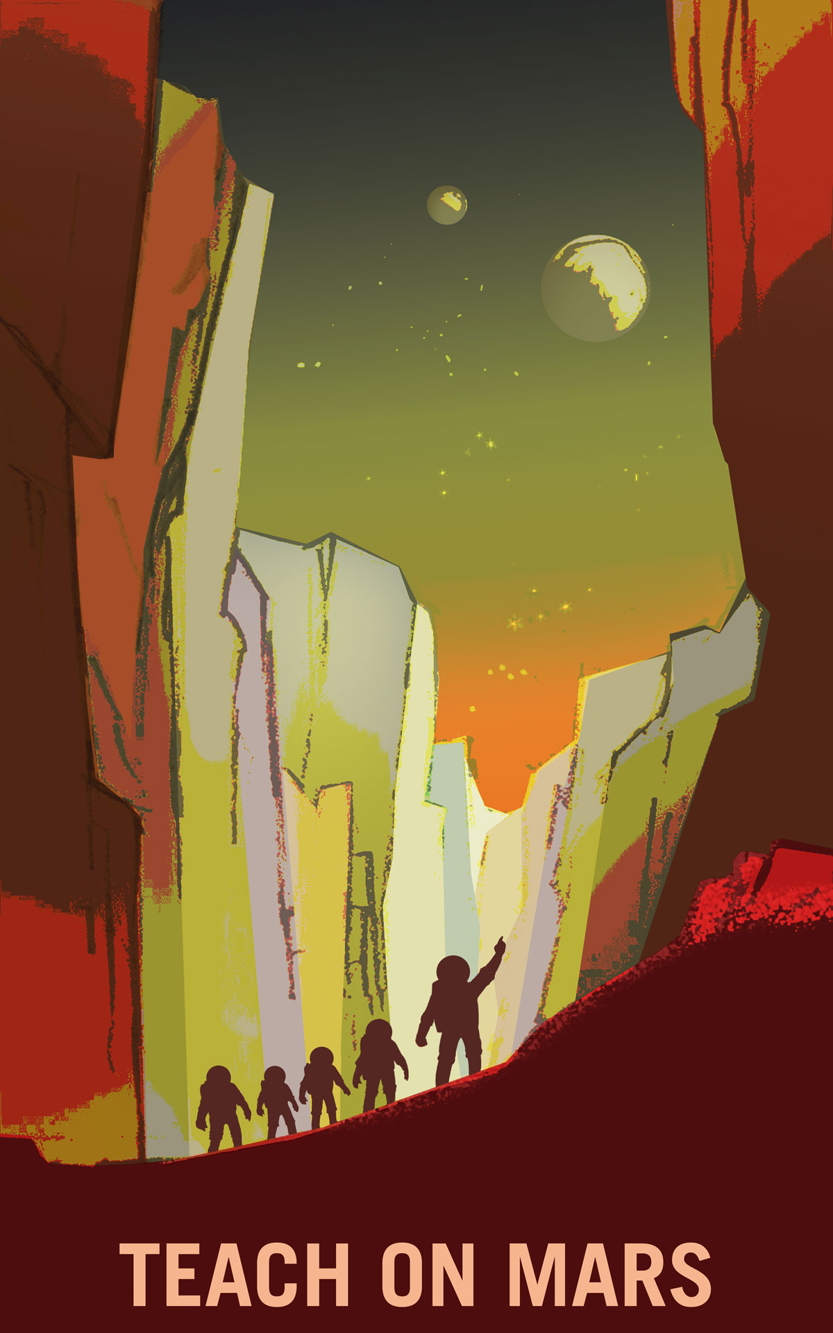 As with NASA’s last bundle of posters, the new pieces are boldly colored and cleanly designed, with a definite hint of old-school cool—though admittedly, far less retro than the first batch of free wall-worthy illustrations the space agency commissioned. The eight posters, ostensibly created as recruitment tools to entice people to the Red Planet, all depict spacesuit-clad astronauts engaged in the ordinary-yet-electrifying activities of Mars life: a technician hard at work repairing an antenna, the moon Phobos floating in the background; a stoic farmer, shovel in hand, overseeing his crops in an orbital greenhouse; an explorer rappelling down into the 4,000-mile Valles Marineris canyon, loose stones plummeting into the 23,000-foot drop.