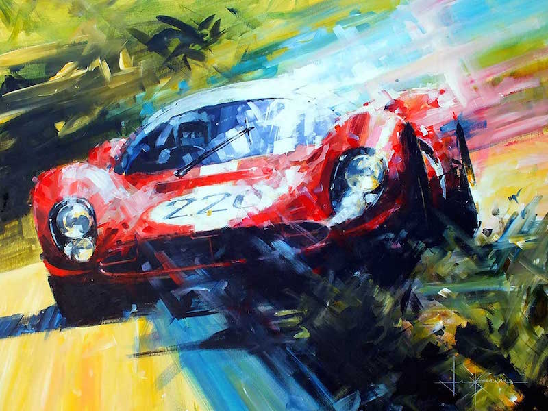 When a fast car is captured by an artist, it’s usually at 1,000 frames per second. We’re habituated to recognizing speed on film; rarely are we asked to acknowledge it on a canvas.
