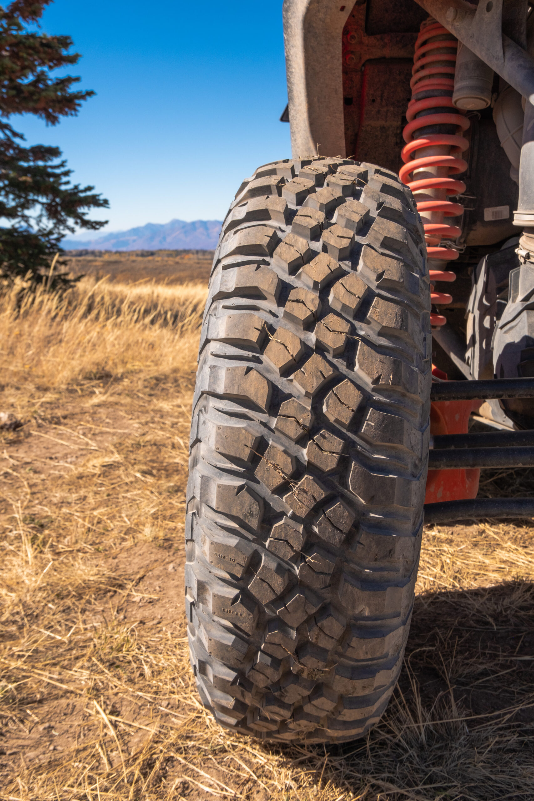 Can-Am’s stock Maxxis Bighorn 2.0 off-road tires are beastly pieces of kit. They’ll plow through mud, snow, and dirt and they served us well throughout our first 1,000 miles of off-road fun. But they are loud and wear quickly.