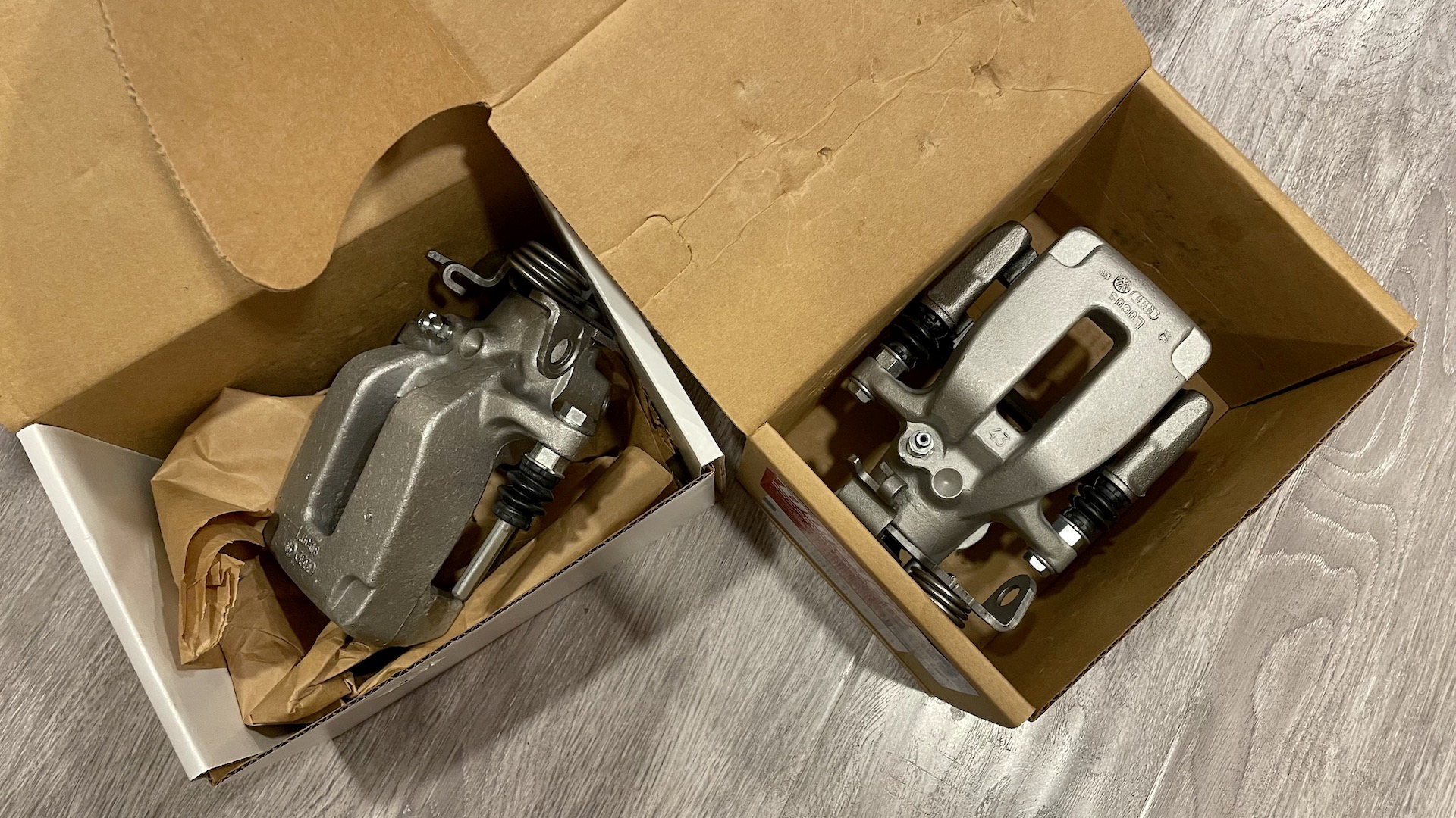 While attempting to push the single piston on the driver-rear caliper back, the rubber boot promptly gave up the ghost and started leaking a lot of fluid out at the seam, so the factory unit had to go. I sourced a set of fresh rear remanufactured units from AutoZone and threw them in without issue. Replacing the passenger side was extra work, but I comforted myself by imagining the original springing a leak at the worst possible time in the future. Crisis averted.