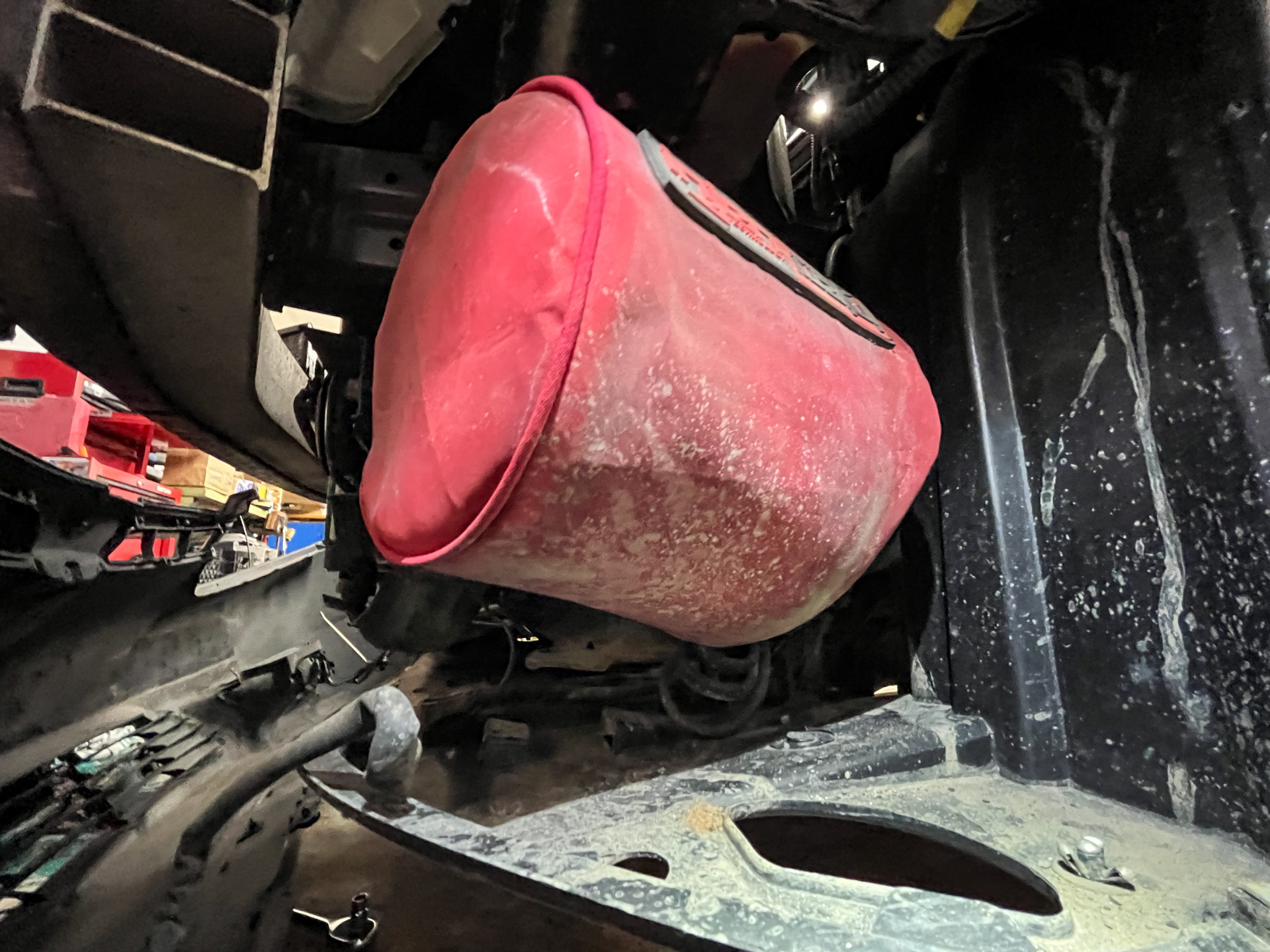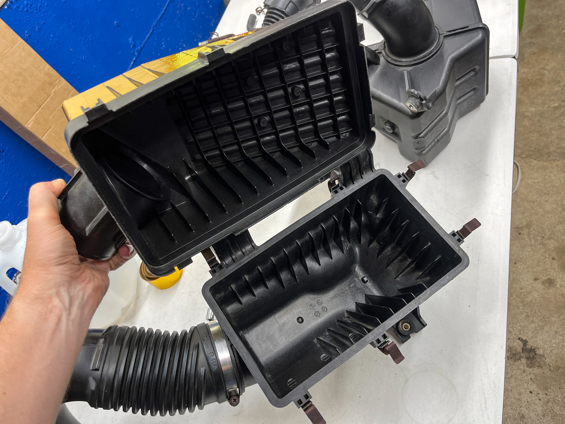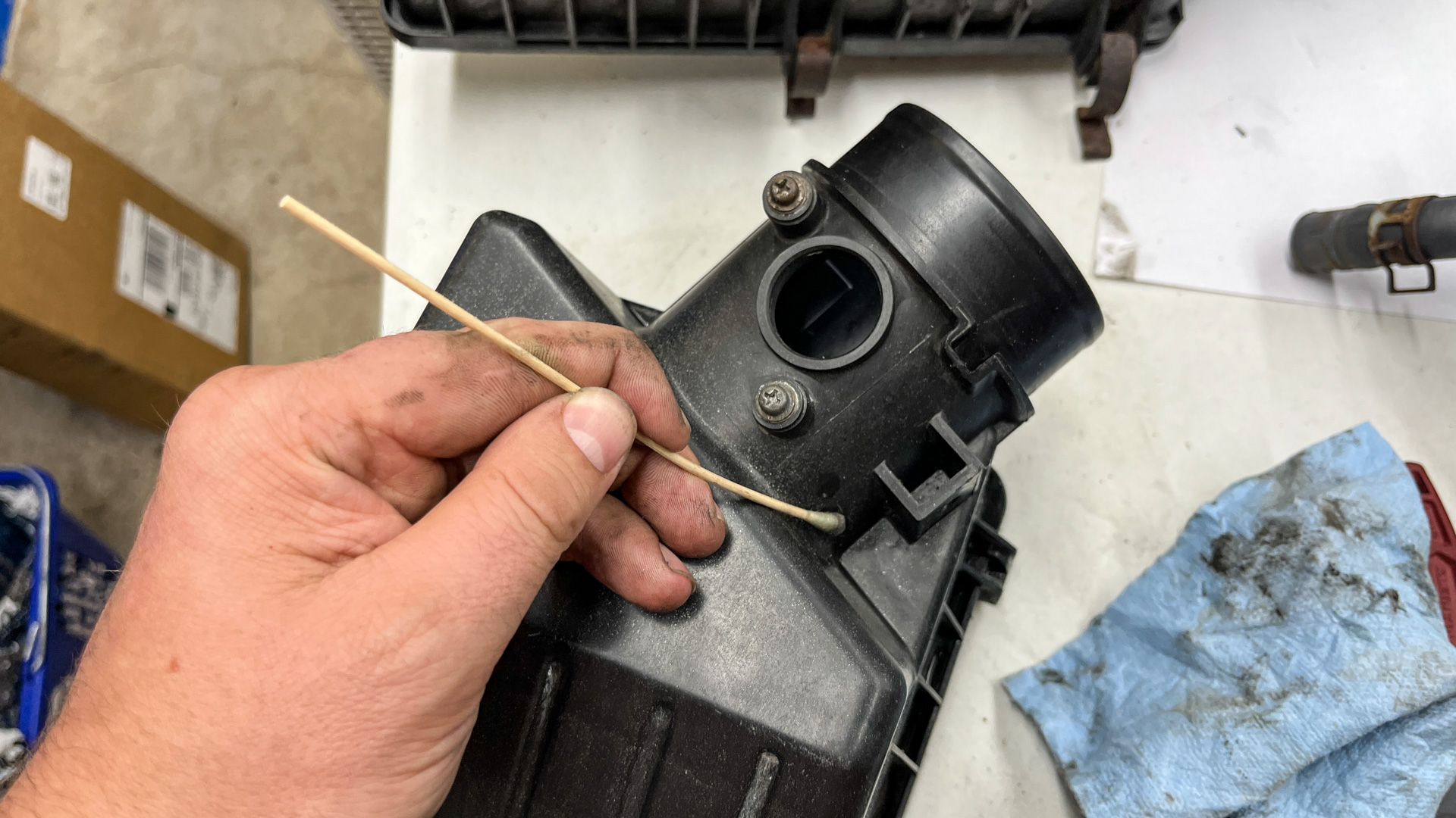 I mentioned that the MAF sensor is sensitive—to protect it during this deep clean, I just popped it out of its housing and put it in a Tupperware box to protect it from the dust, paint spray, and dog hair that’s always wafting around my garage.