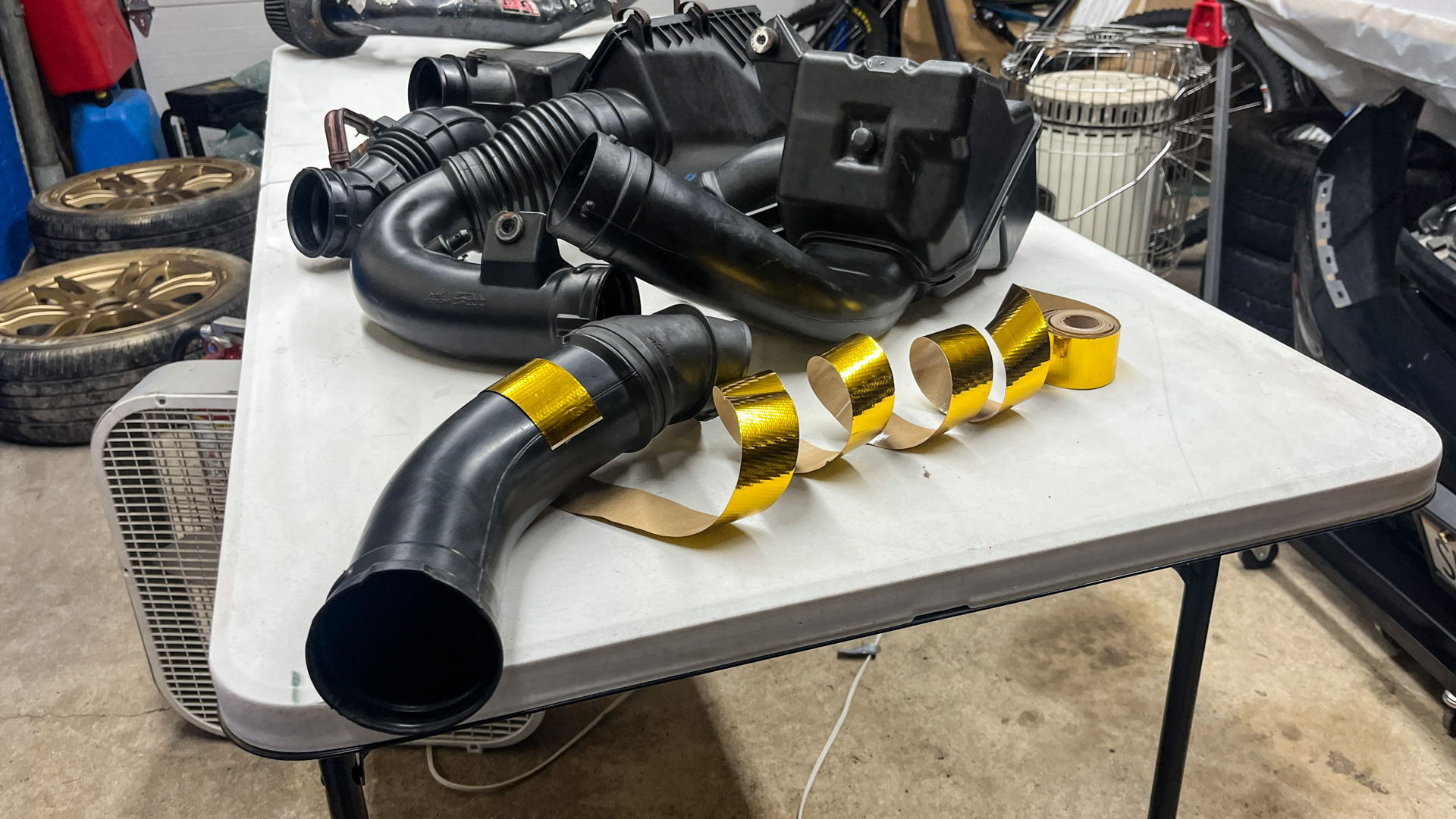 After deep-cleaning the stock intake pieces with WD-40 Brand products, cotton swaps, and degreaser wipes, it looked a lot sharper than it’d come from the junkmongers. To elevate the look beyond factory-fresh, I copied a page from colleague Chris Rosales’ school of tuning and wrapped the hard pieces in heat-reflective gold tape.