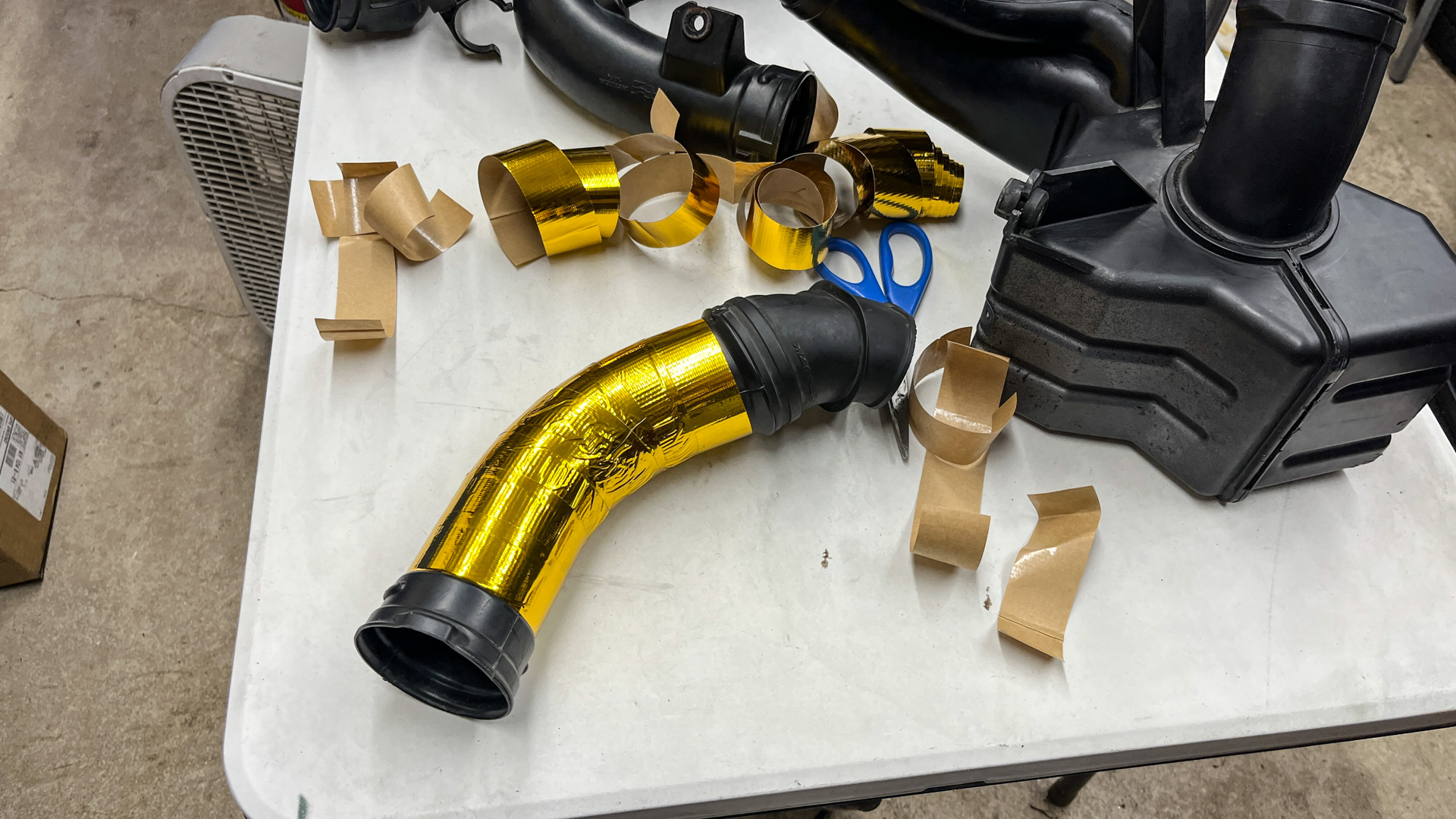 - If you’re doing any gold wrapping of intake parts, remember that the wrap needs to be laid in small pieces, as flat as possible (it will bunch up if you try to wrap a pipe like you’re using a bandage)