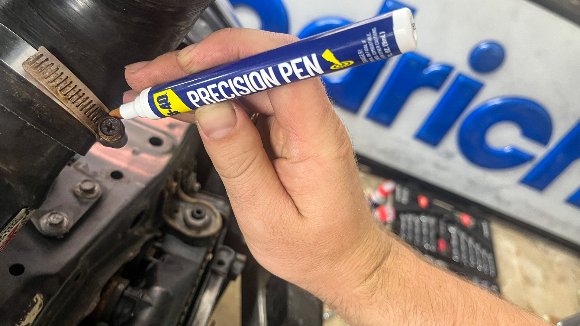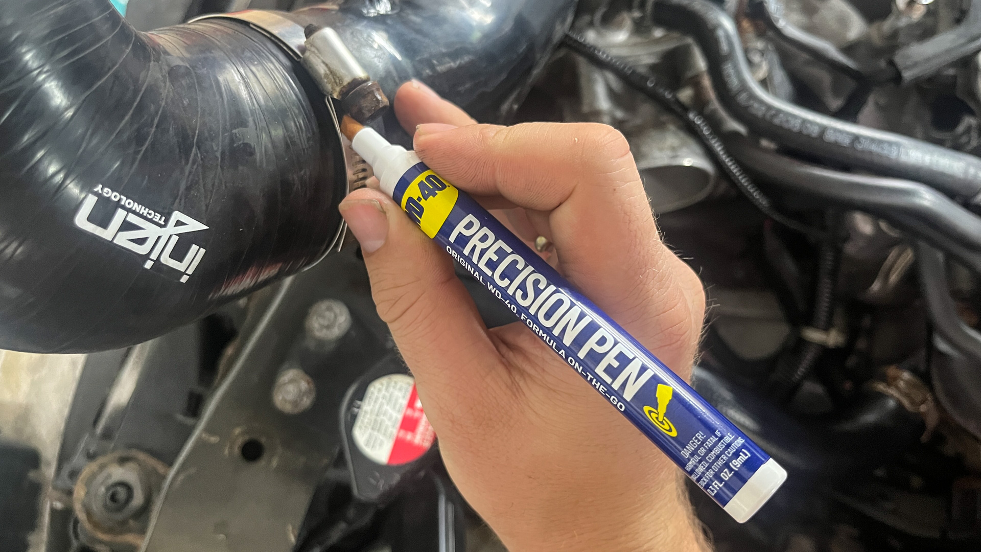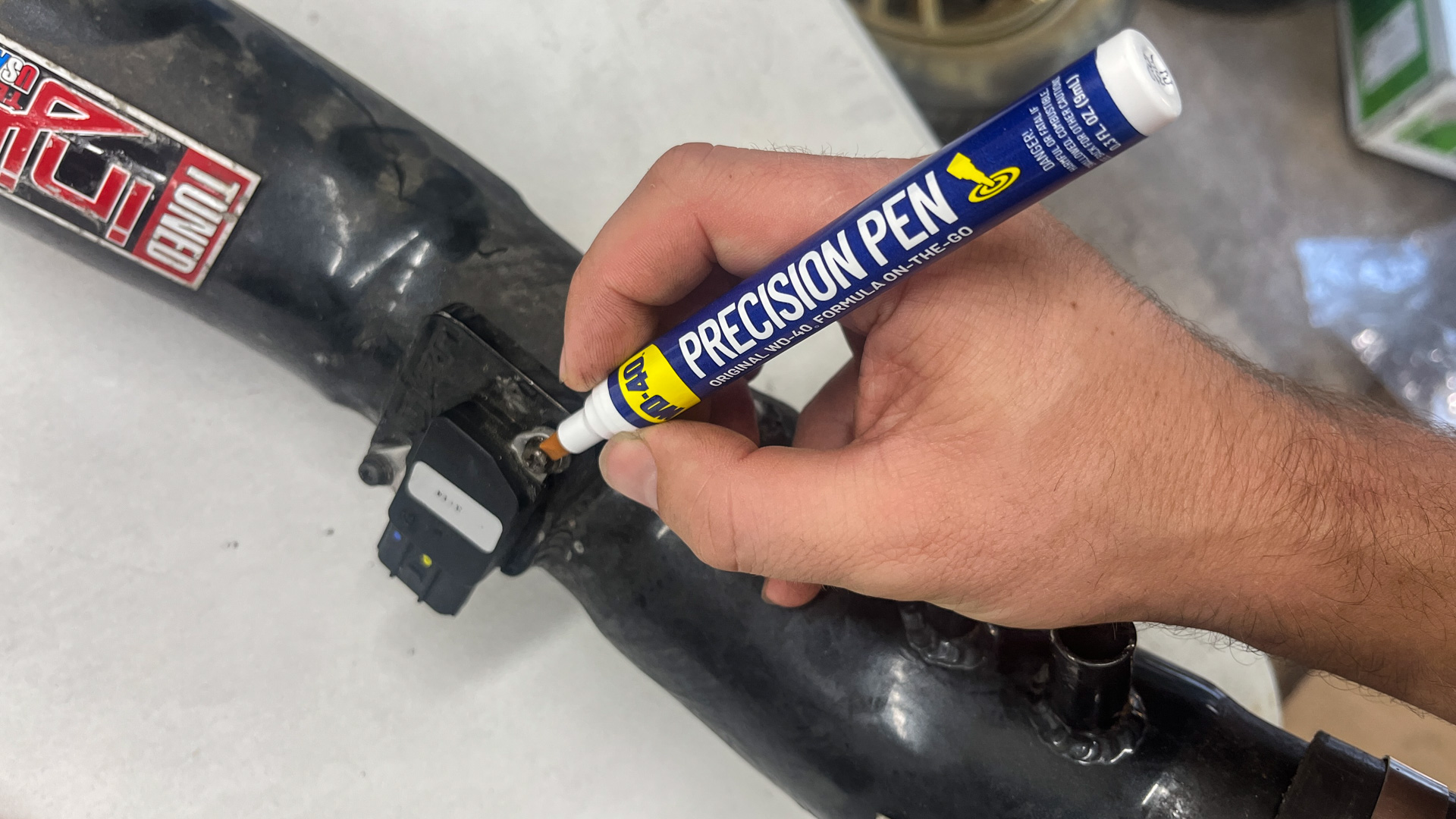 The Precision Pen is exactly what it sounds like: A pen-like product that dispenses WD-40 Multi-Use Product, the Original WD-40 Formula, with controlled flow. The two biggest advantages of this dispenser are portability and, well, precision. I particularly liked using it on the screws holding the MAF sensor to the intake—that’s a sensitive piece of electronics and even though aerosol-style WD-40 Brand products are safe on most under-hood surfaces, it was nice to be able to keep the product very contained.