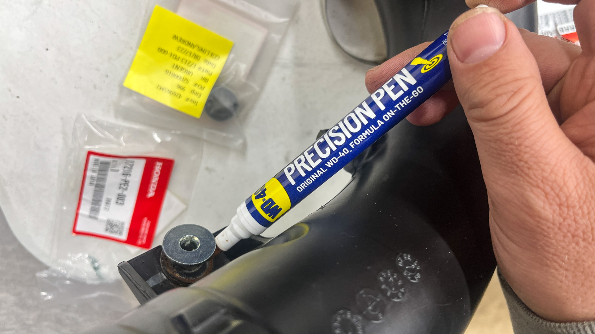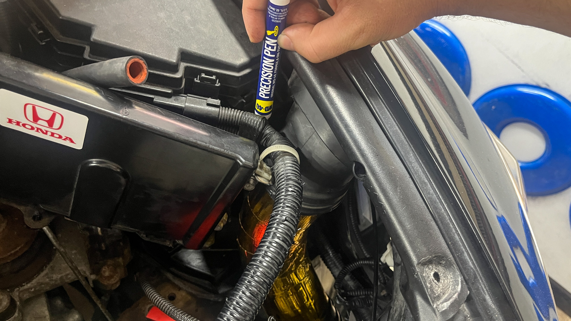 I found one more perfect application for the WD-40 Precision Pen as I put the intake system back together. Some of the pipes are held in place by bolts that run through metal colors that are surrounded by rubber—a small dab of the Original WD-40 Formula from the pen’s tip made them slide together very easily without any spillage onto my precious pretty gold wrapping.