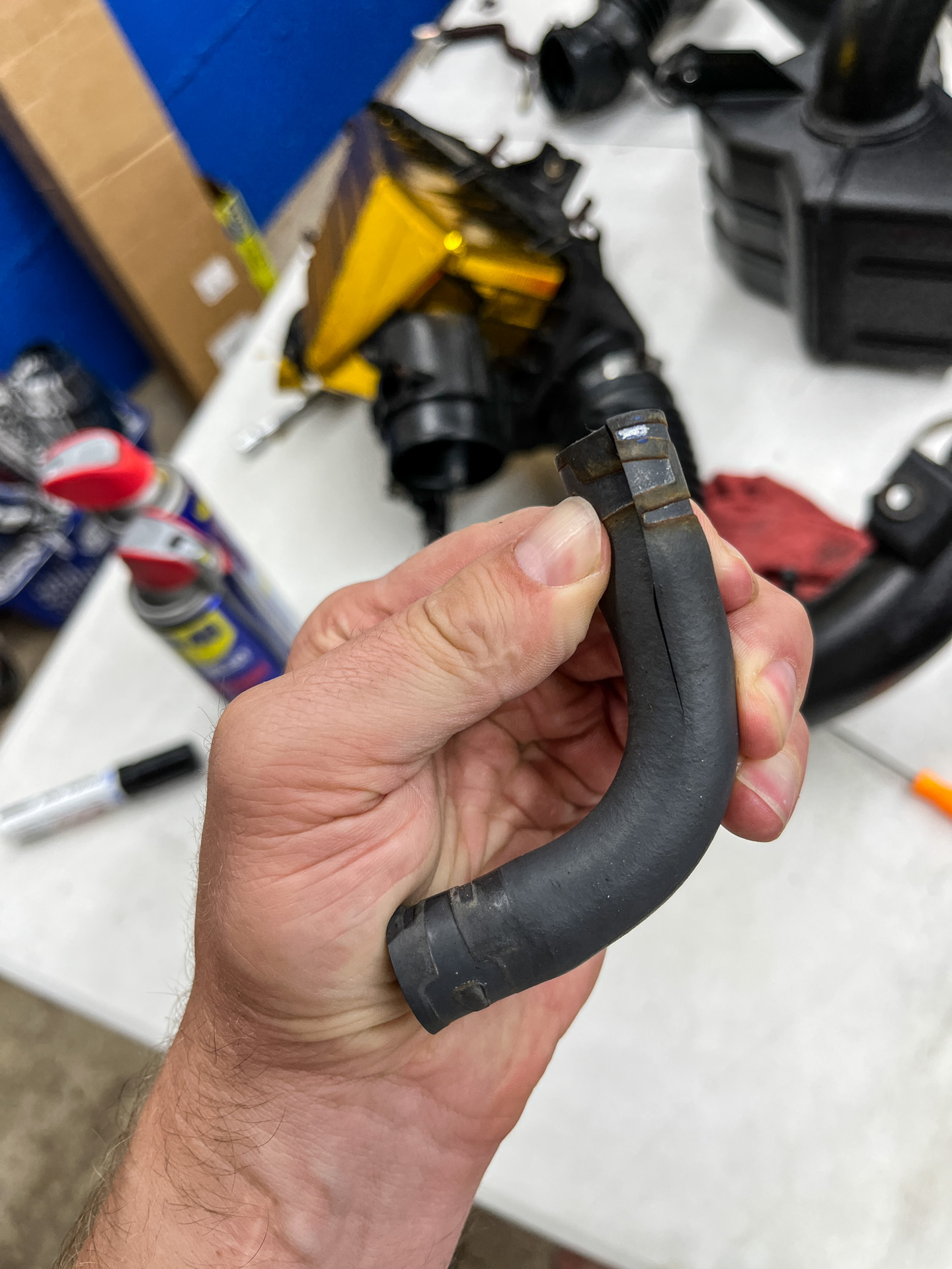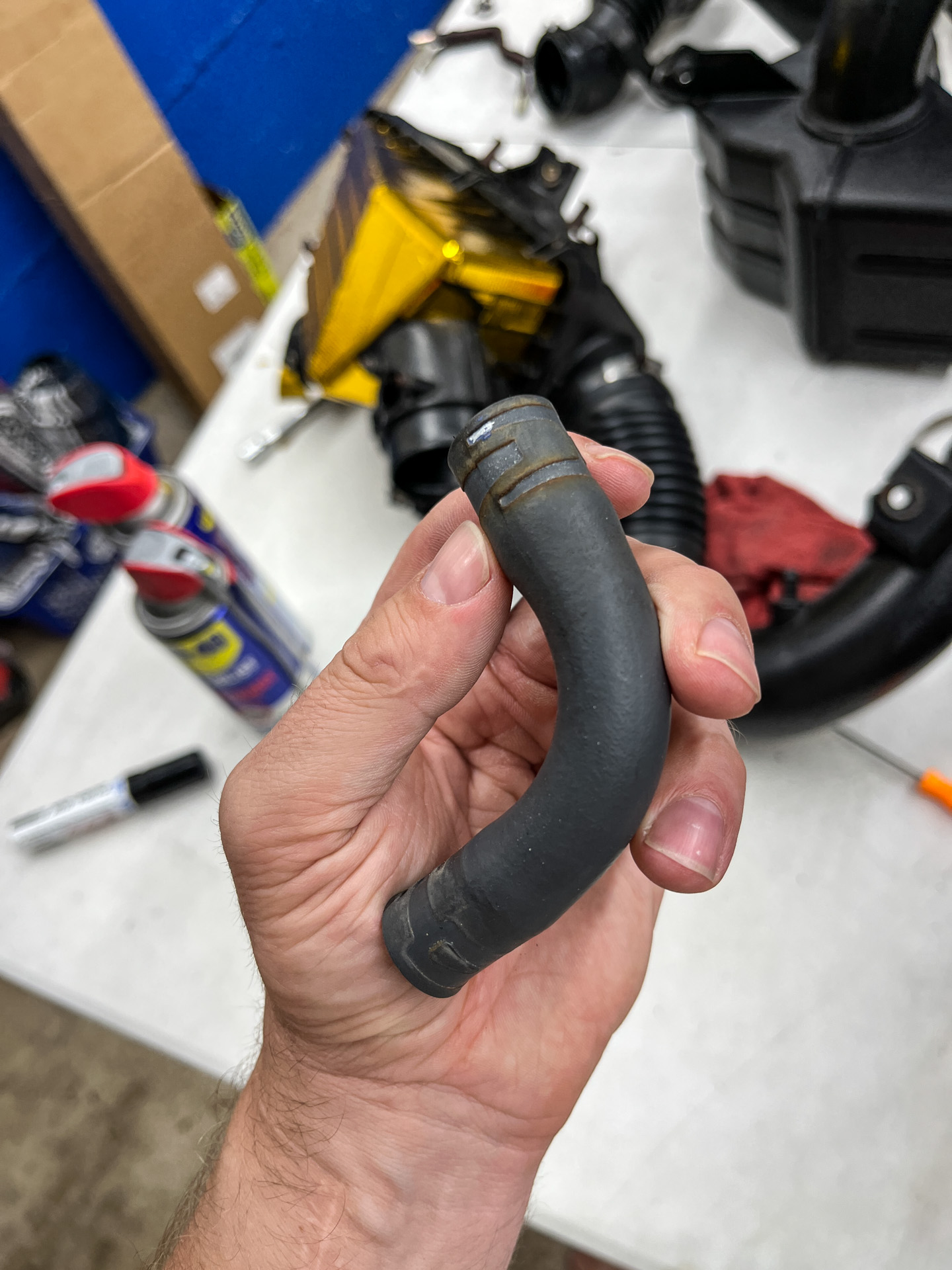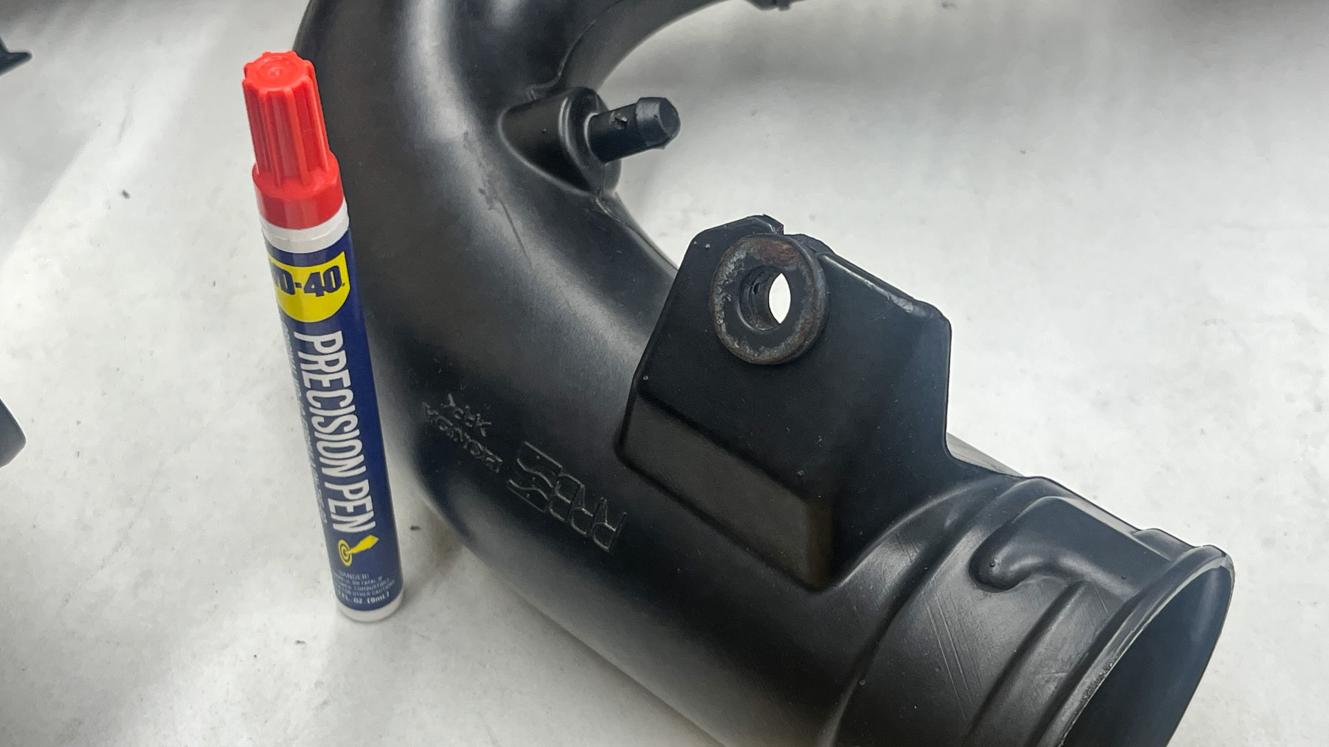 First I figured I’d clean the heck out of the used intake pieces I’d gathered from various eBay sellers. Once again, I pulled the WD-40 Precision Pen out of my pocket for just the right amount of light lubrication that cranky old hose clamps needed to come open without stripping. I really started loving this little thing.