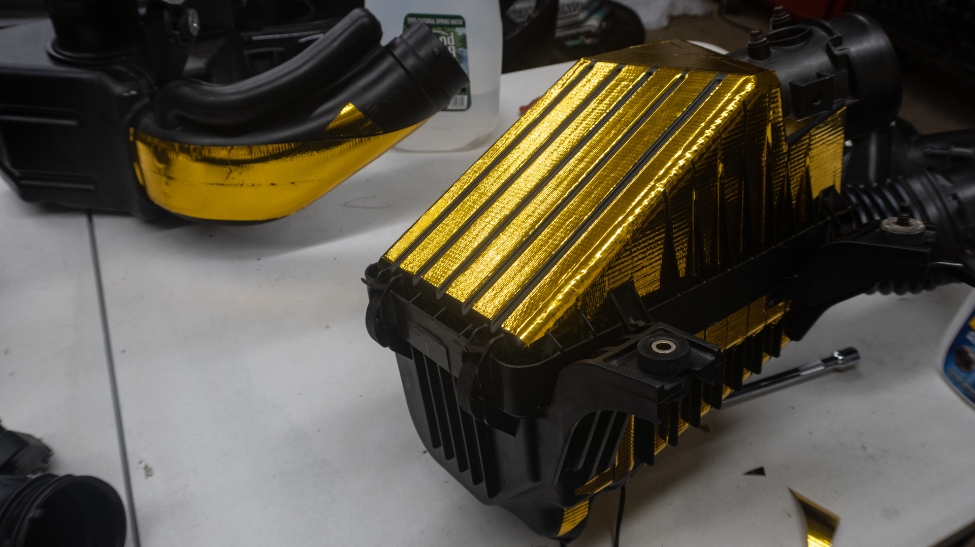 Instead of completely covering everything, I was very tactical about laying the gold down, making sure to trace the stock air box’s existing lines and run strips of tape in an aesthetically pleasing pattern. This is basically the car-nerd equivalent of mowing a crosshatch pattern into your lawn.
