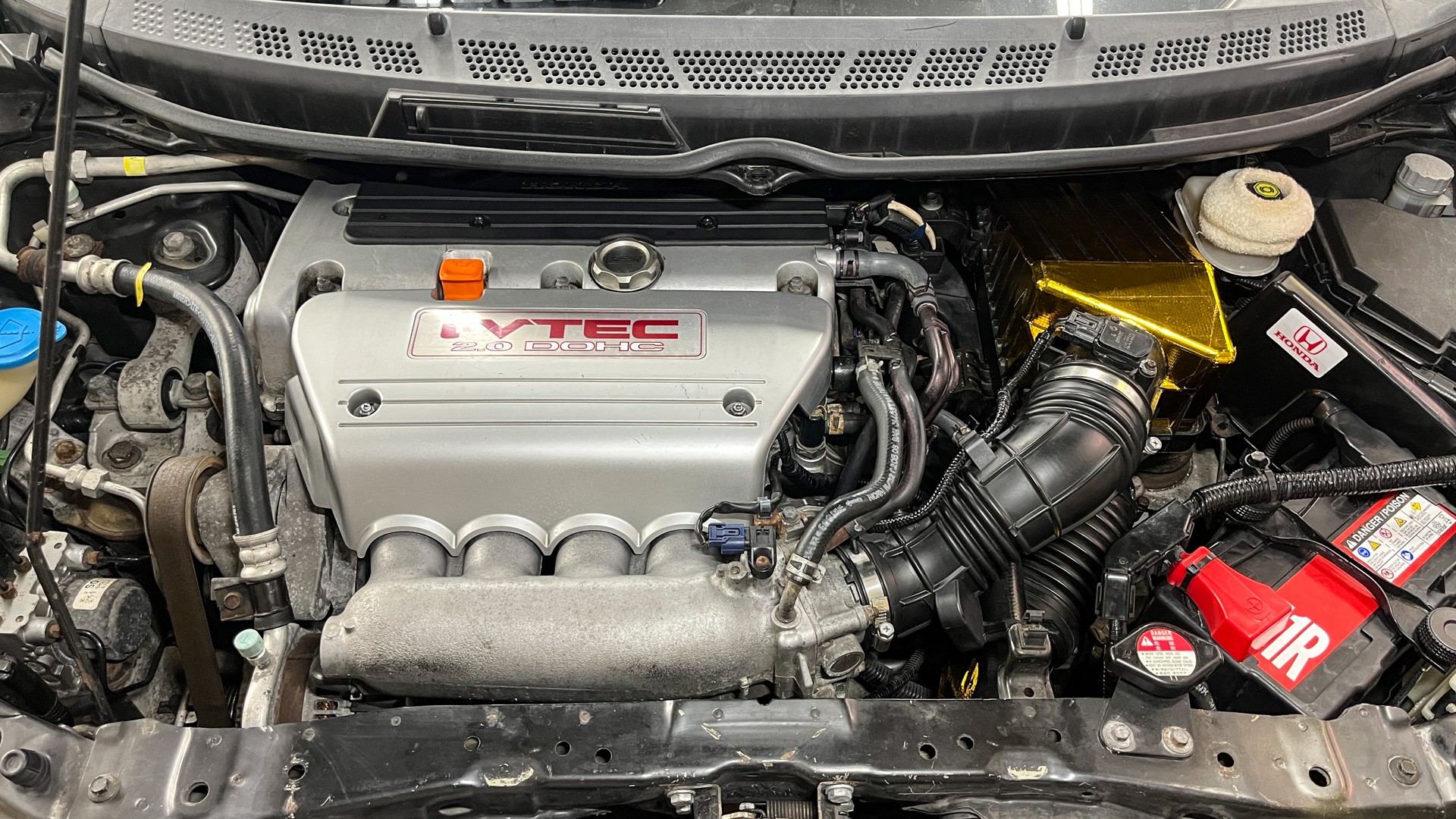 I had my car running nicely with a custom ECU tune, programmed via Hondata, to let it run optimally with the Injen CAI and A’pexi World Sport 2 cat-back exhaust system. I’ll have to adjust the engine tuning again for the stock airbox, but I’m curious to know if there’s any more optimization to be found by running a high-end air filter in the stock location. But that’ll be a test for another day.