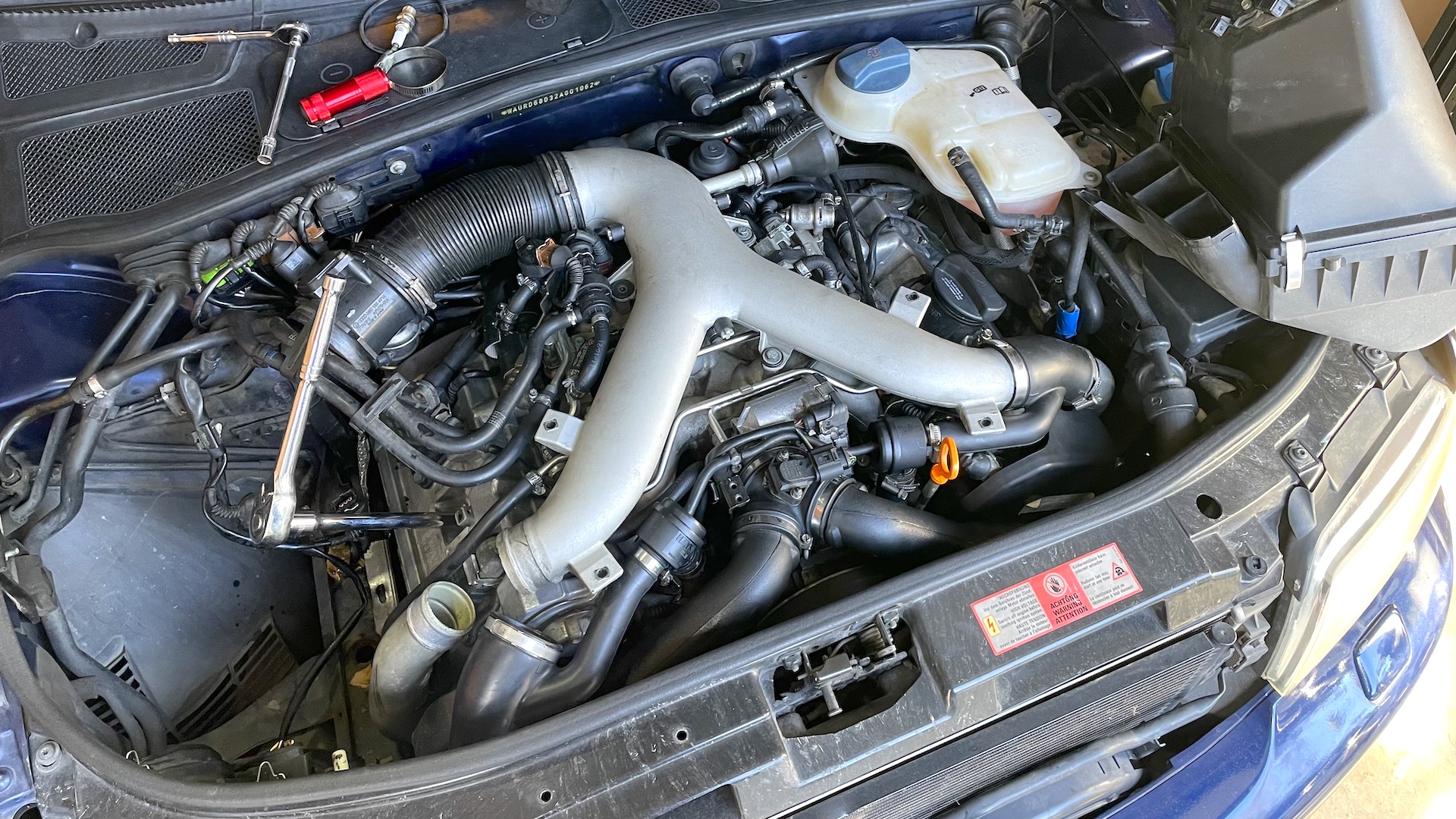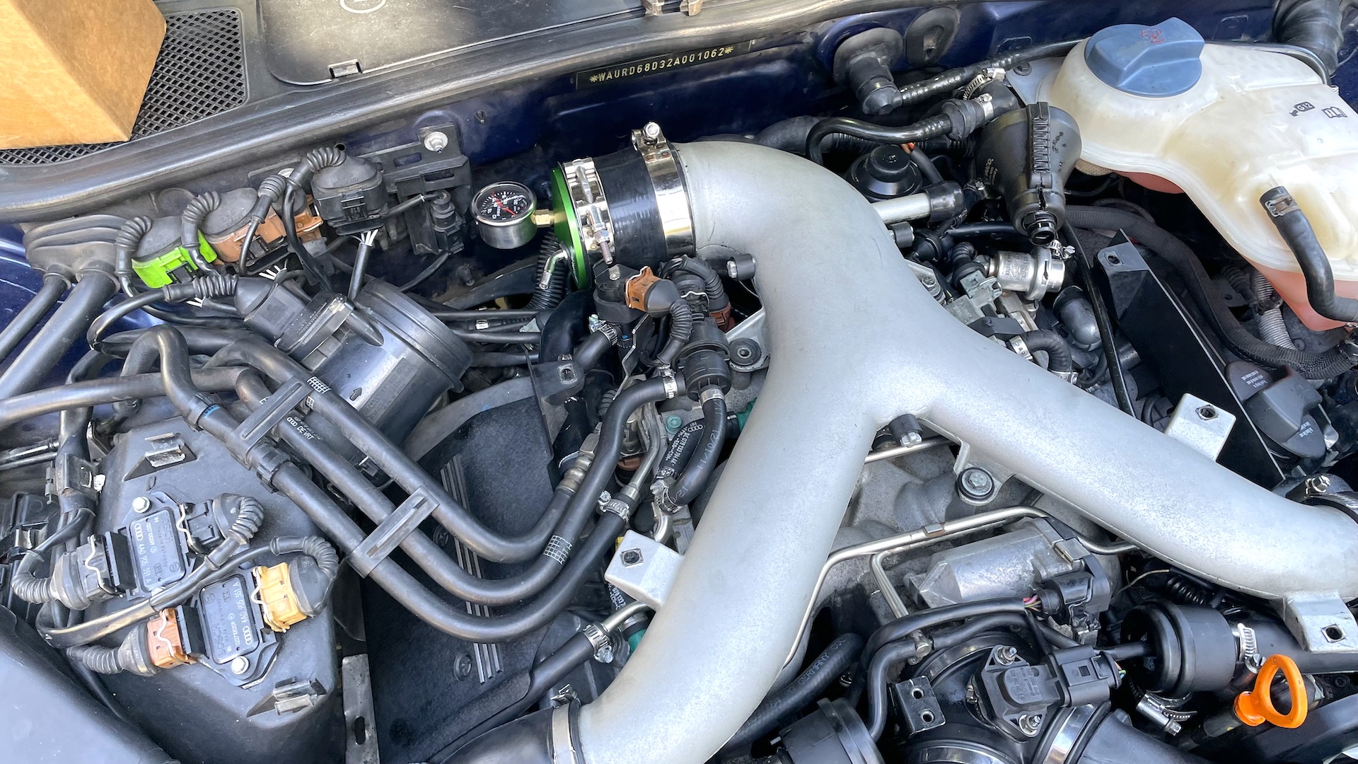 Internet research concluded that the most likely cause of this was a boost leak—the B5 S4 is infamous for having them at seemingly any mileage. After pulling off and inspecting various bits of intercooler and intake piping, as well as performing a proper, pressurized test, nothing stuck out besides a tiny leak in the passenger-side diverter valve.