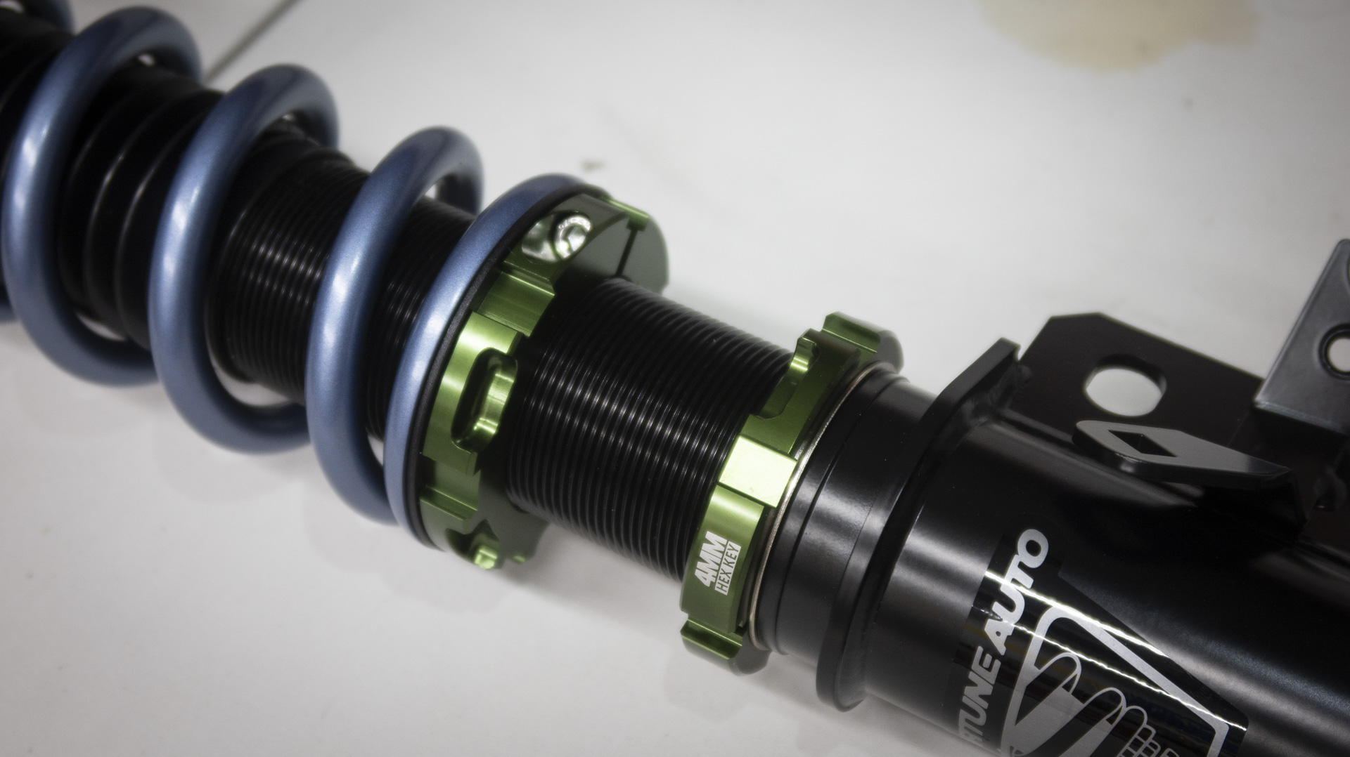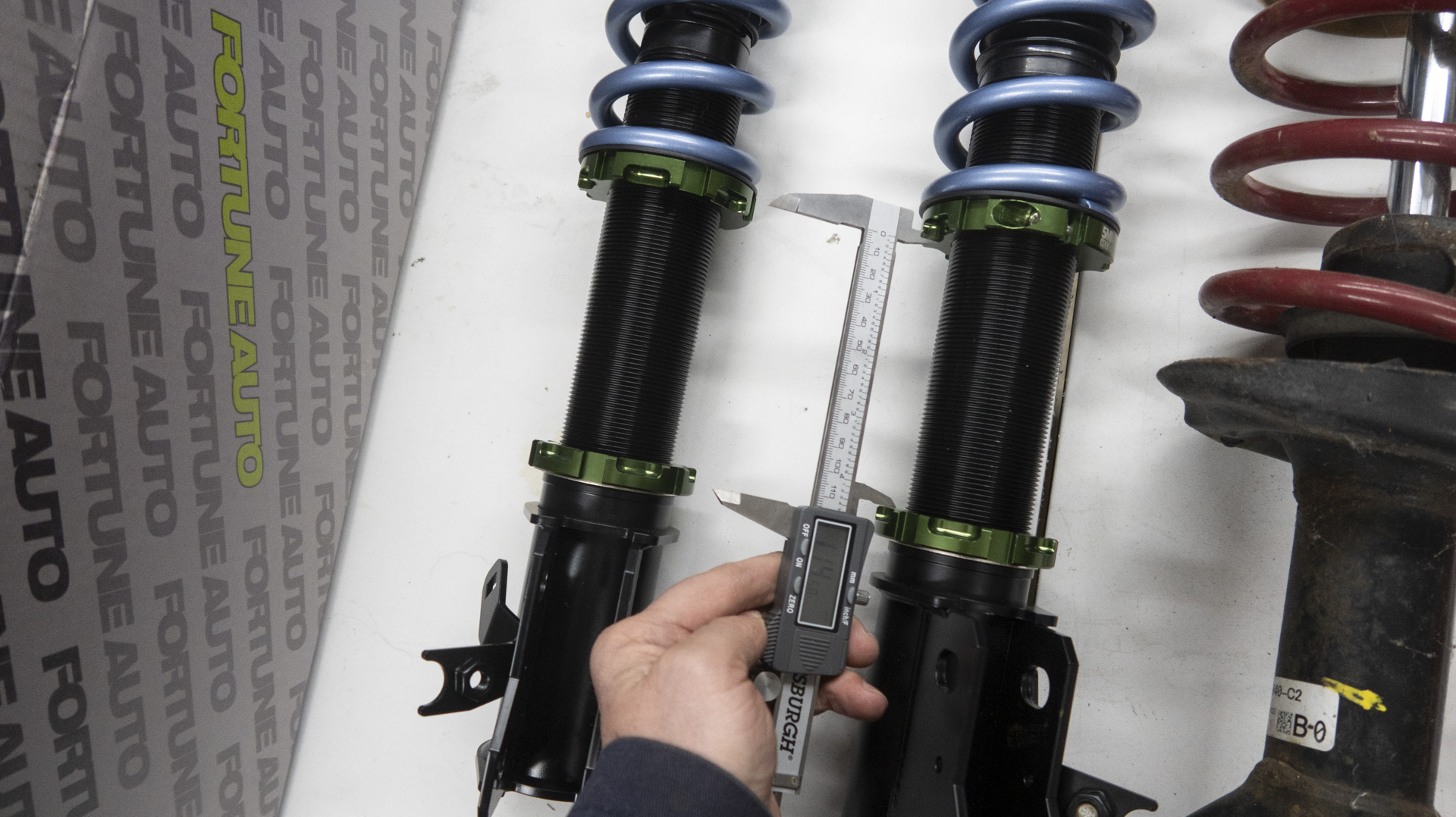 The hard part of coilover assembly, the valving, was done when my Fortune Auto 500s arrived. That’s the actual assembly that happens at the factory. Setting up these coilovers in my car specifically required me to set the spring preload at the front, so that’s one measurement I had to do, then I had to set ride height at the front, then do both at the back in a slightly different way.