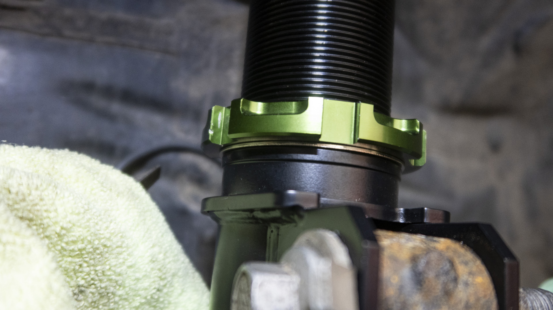 I had to do a couple of mechanic’s moves putting these coilovers on that weirded me out a little. The first was setting the locking collar on the shocks themselves. You do this by threading a ring down to the bottom of its threads, and then smacking it with a mallet and screwdriver, chisel style. The instructions said to wrap a microfiber cloth around the tip of the screwdriver, which I did, but I still marred the heck out of the coilover’s collar. I was careful, too! Oh well, that’ll be covered in road grime for the rest of its life starting tomorrow. It doesn’t need to be faultless. But I was still a little sad about nicking the beautiful green coating before I even left the garage.