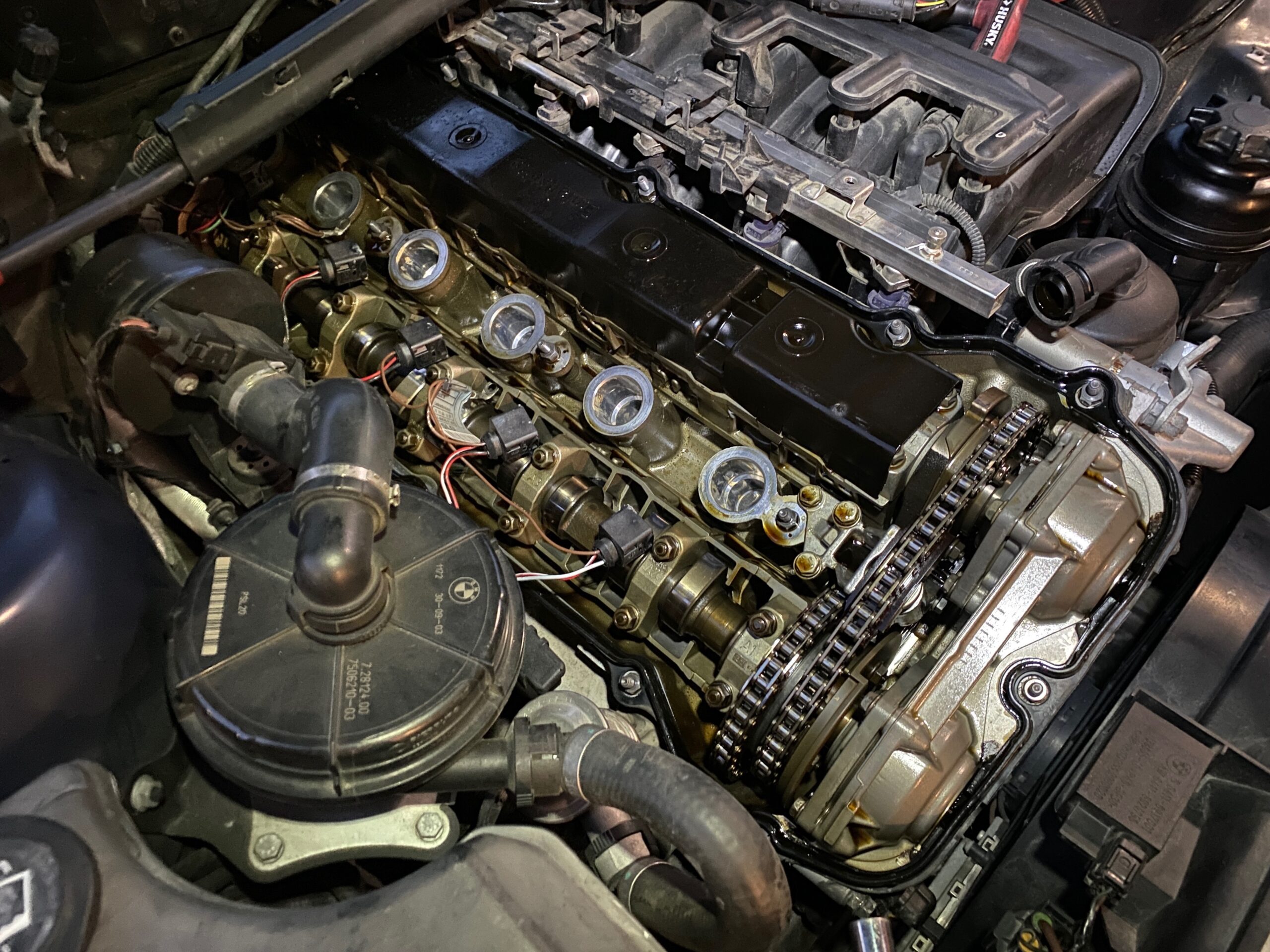 The truly ZHP-specific parts are simple: the aforementioned camshafts; the 6,800-rpm redline gauge cluster with red needles; the black or silver cube trim standard from BMW Individual; the Alcantara steering wheel, seats, shift boot, and parking brake boot were ZHP-only; a slightly shorter ratio rear differential; and factory threadlocker applied to the nut that fastens the oil pump gear to the oil pump, part number 11 41 7 897 238 compared to 07 11 9 905 857 for the normal nut.