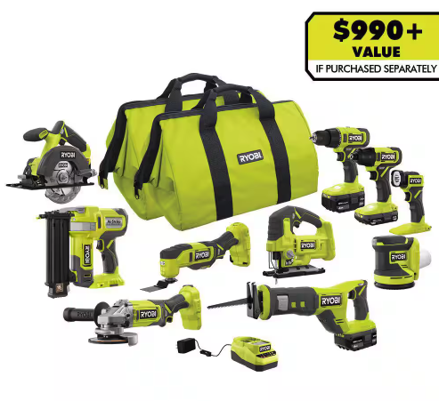 See ItRYOBI ONE+ 10-Tool Combo Kit with (1)1.5Ah Battery, (2)4.0Ah Batteries,Charger for $379.00