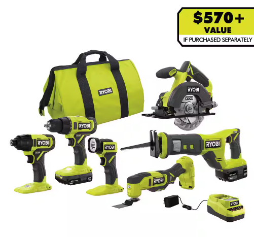 See ItRYOBI ONE+ 18V Cordless 6-Tool Combo Kit, 1.5Ah Battery, 4.0Ah Battery, and Charger for $199.00