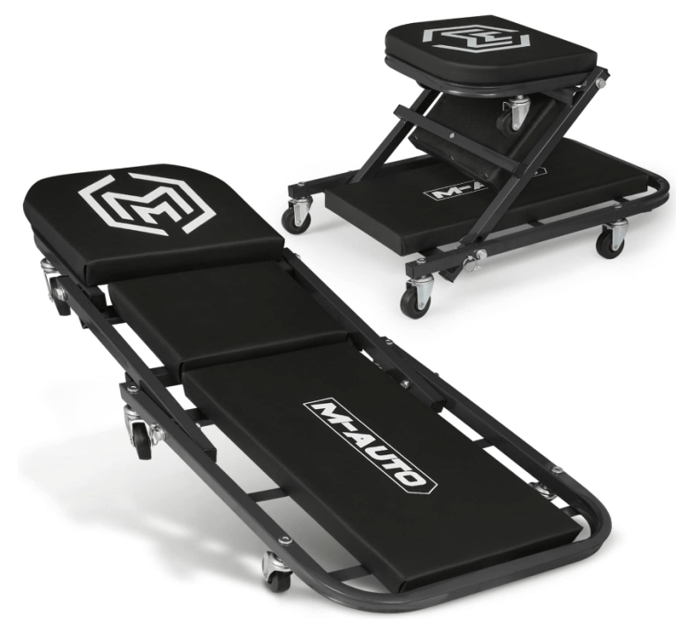 There’s just as much selection in jack stands. I might have to pick up these BIG RED Torin Aluminum Jack Stands for $58.90. I like pin-style stands, and these are nice and lightweight, too. I’ve also picked out a Gearwrench Bottle Jack for $54.99. I hardly ever use a bottle jack to lift my car, but once it’s in the air, to lift up the engine while doing an engine mount or trying to get a control arm positioned just right to get the bolt in, these are invaluable. Lastly, I can’t seem to find my creeper seat. So I might get this multi-position creeper for $41.61, and I’ll be able to sit for suspension and brake work or lay it down for napping—errr working under the car.