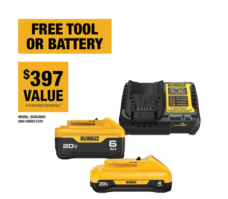 Right now, you can hop on the DeWalt 20V MAX Lithium-Ion Battery and Charger Starter Kit for $199.00 and get your pick of one of 12 free power tools at Home Depot—that’s a $200+ tool, for free. This is a great way to start your new power tool collection or to simply add some batteries to the mix and grab a freebie while you’re at it.