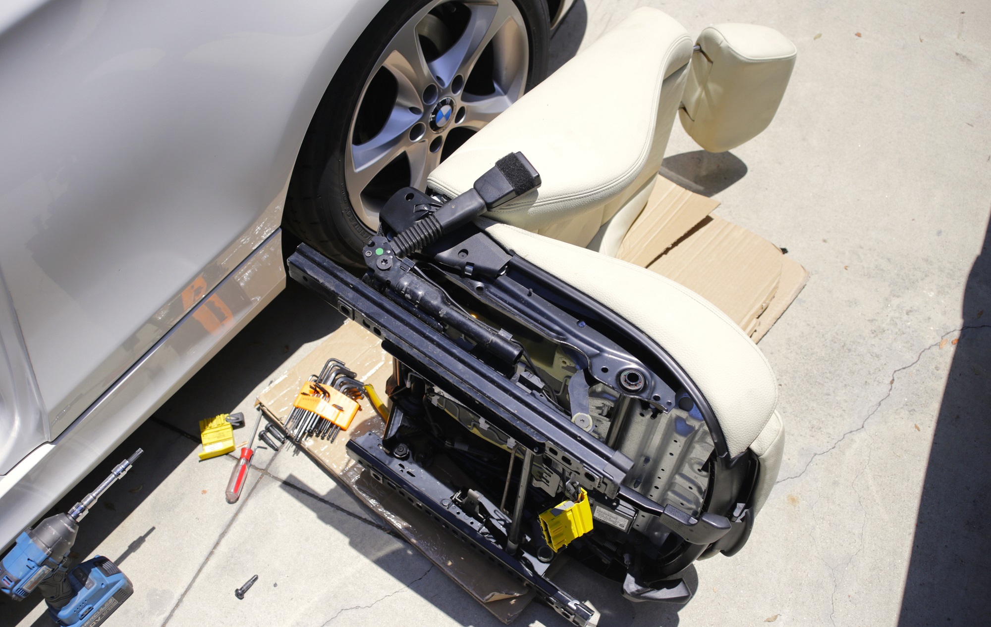 Actually swapping the seats was an easy process because I had a bunch of parts that didn’t require any customization. Once I had both seats sitting side by side to compare connectors, I swapped over the seat belt receptacle and took my time ensuring I had all wiring harness connectors routed properly, which BMW thankfully does quite logically. There is only one way that three separate connectors—one for the seatbelt warning and pretensioner (also known as the teeny little explosive charge in the event of an accident), one for the airbag, and one for I think the E81 seat’s optional heating and adjustable bolsters—can sit in the big yellow main harness.