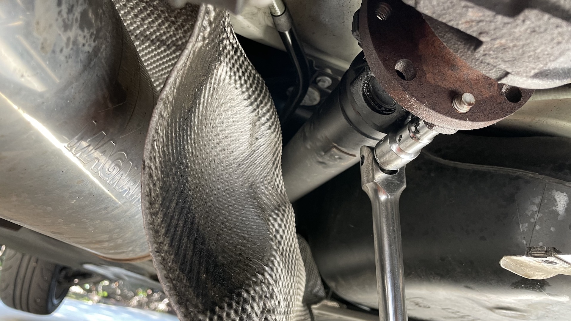 Reinstalling the E12 driveshaft and CV axle bolts took a while, though, as I had to keep getting up to put the car in and out of gear to hold the driveshaft in place. But with some patience, I had all sixteen torqued down properly.