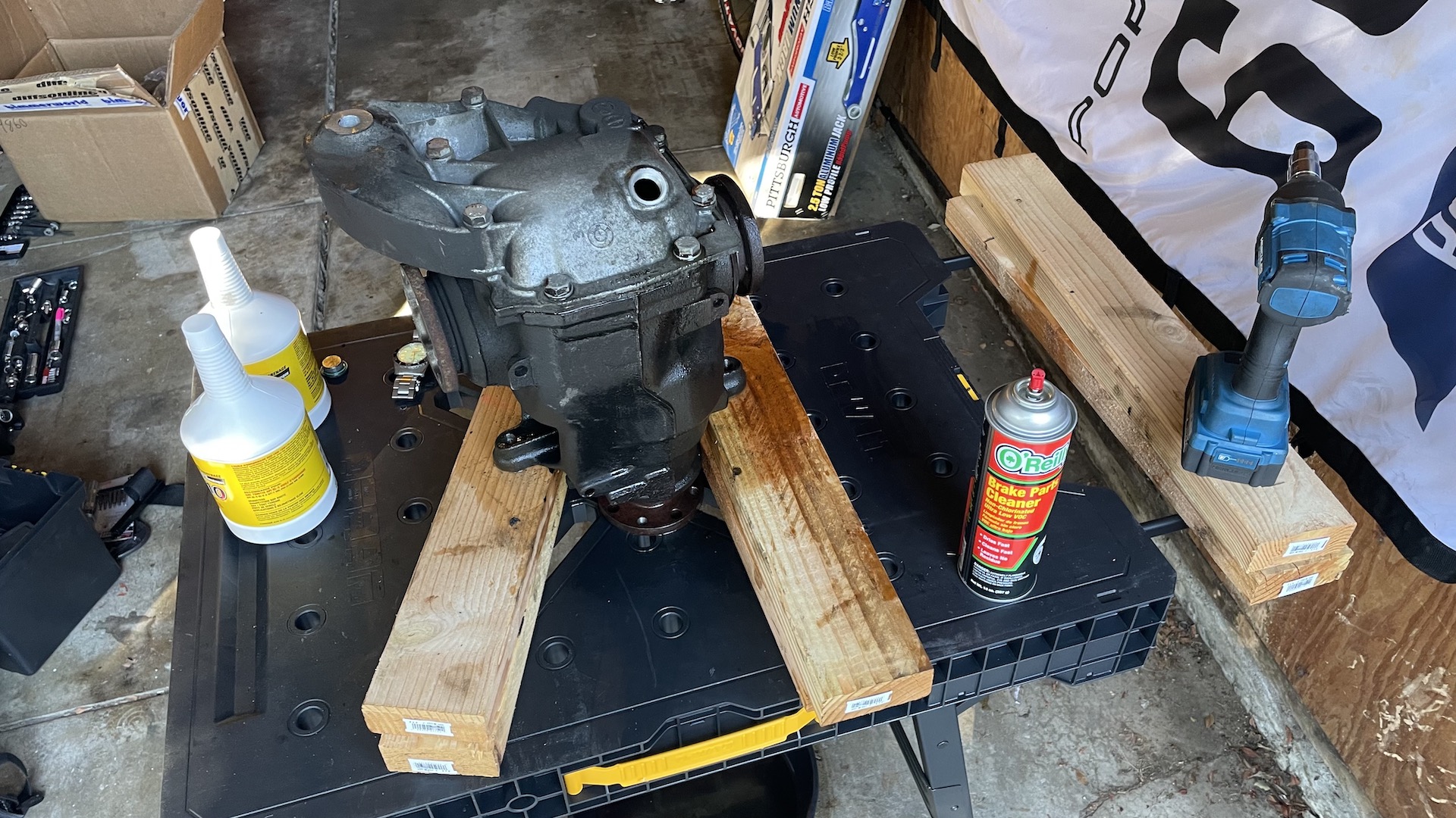 I don’t have a workbench in my garage yet, so I bought a sturdy folding unit to fill the gap. I’m tired of doing assembly on my driveway, so this would make cleaning, prepping, and attaching the diff cover, as well as filling it up and torquing the bolts, far easier. I also bought a few small blocks of wood to keep it supported and stable.