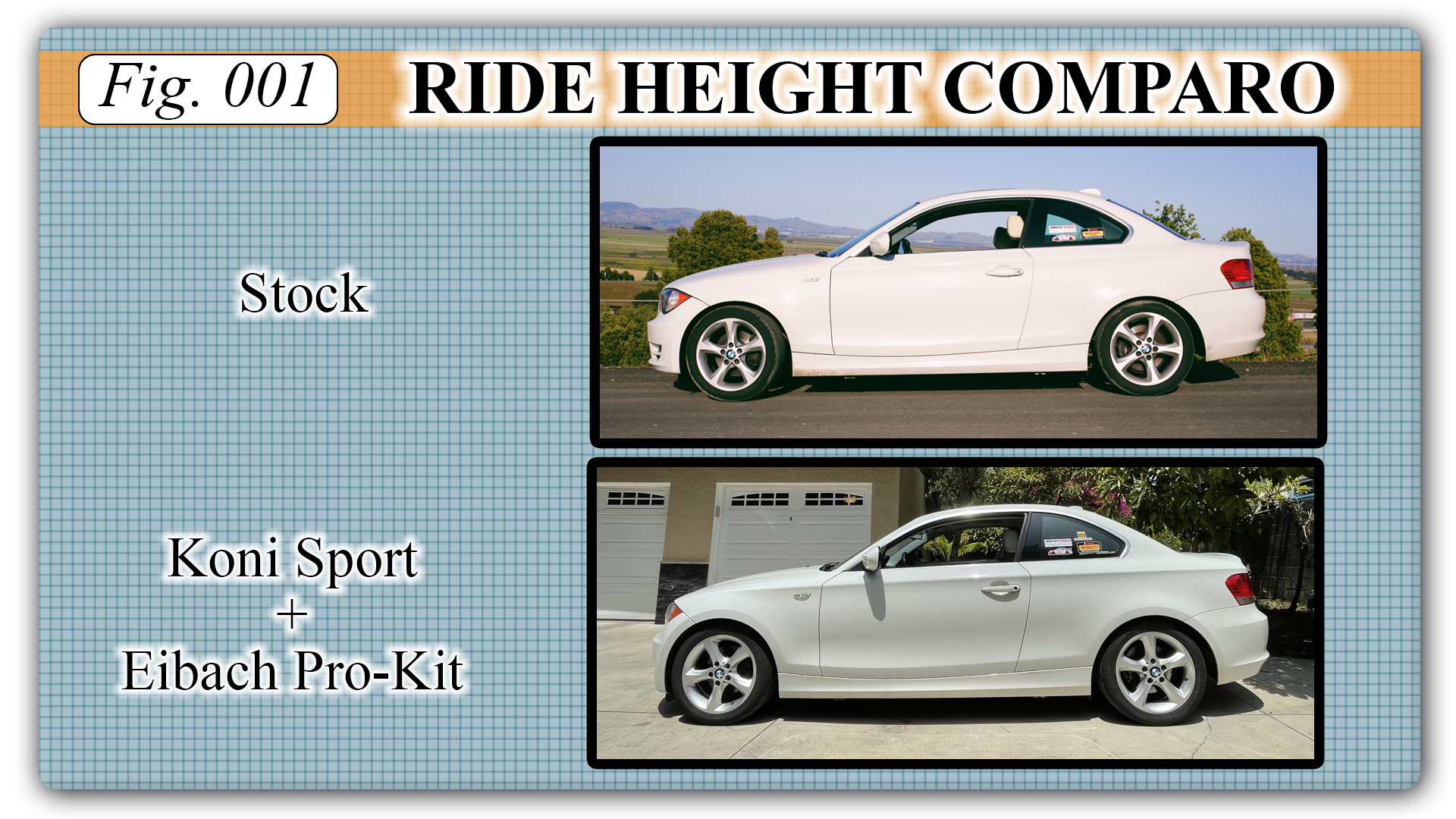 Since I’ve been researching and working with cars for many years, I didn’t have to do much searching to confirm my selection of parts. My E82 BMW swapped out its suspension in favor of some performance-inclined adjustable Koni Sport dampers and Eibach Pro-Kit springs. These Konis are affectionately referred to as Koni “yellows” among DIY tuners, to differentiate them from the Koni STR.T “orange” model which we’ll discuss in another post. It seems like a lot of 128i track and autocross enthusiasts who aren’t running coilovers really dig this route, so I figured it’d be perfect for me since I had similar driving-fun intentions.