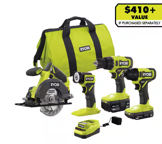 But wait, I have another proposition if you don’t need the charger. You can buy this, ONE+ HP impact driver for $89.97 and get a free 2Ah battery. So you’re buying a $90 tool and getting the $70 battery thrown in. Ryobi does this all the time. If you want to build your battery stores, this is the way to do it. The ONE+ 18V cordless 4-tool combo kit for $159.00 is a nice step up. It gets you a drill, a small impact driver, a circular saw, two batteries and a flashlight.