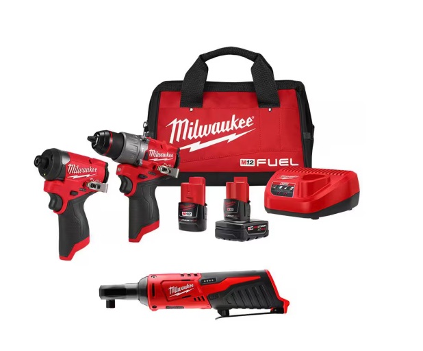 See ItMilwaukee M12 FUEL 12-Volt Hammer Drill, Impact Driver Combo Kit, M12 3/8 in. Ratchet – 38% off for $229.00
