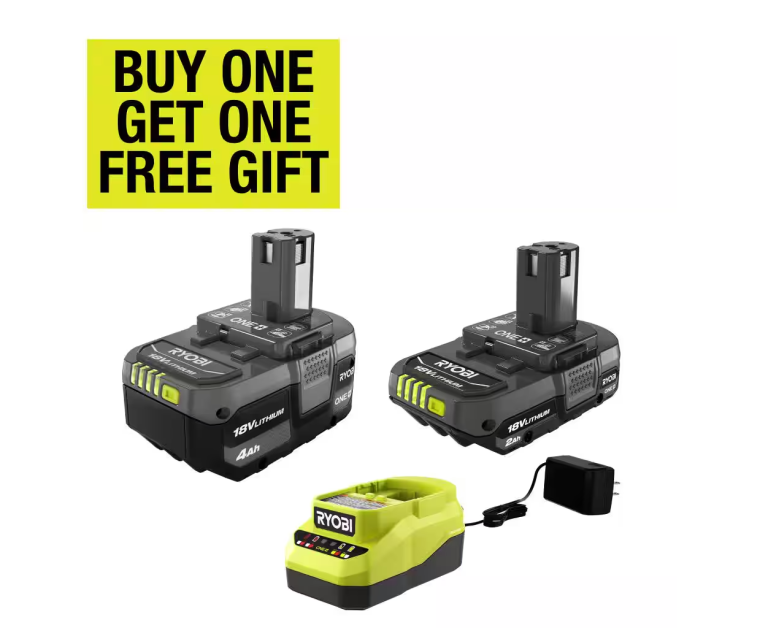 - RYOBI ONE+ 18V Lithium-Ion Starter Kit for $99.00 Plus Free Tool at Home Depot