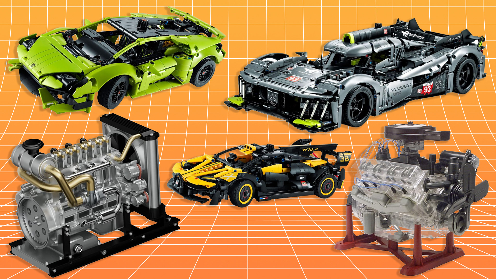 Back to Lego. I’ve included a full price range here. We have a Lambo, a Bugatti, and a GT500, all of which are under $40. There’s also a 1:12 scale Ford GT for $96. That is a good-sized Technic set with lots of technical details, providing insight into how the real car functions. If you want to get even bigger and nerdier, the Technic Peugeot 9X8 24H Le Mans Hybrid Kit will get you deep into the guts of the engine and suspension of the real thing.