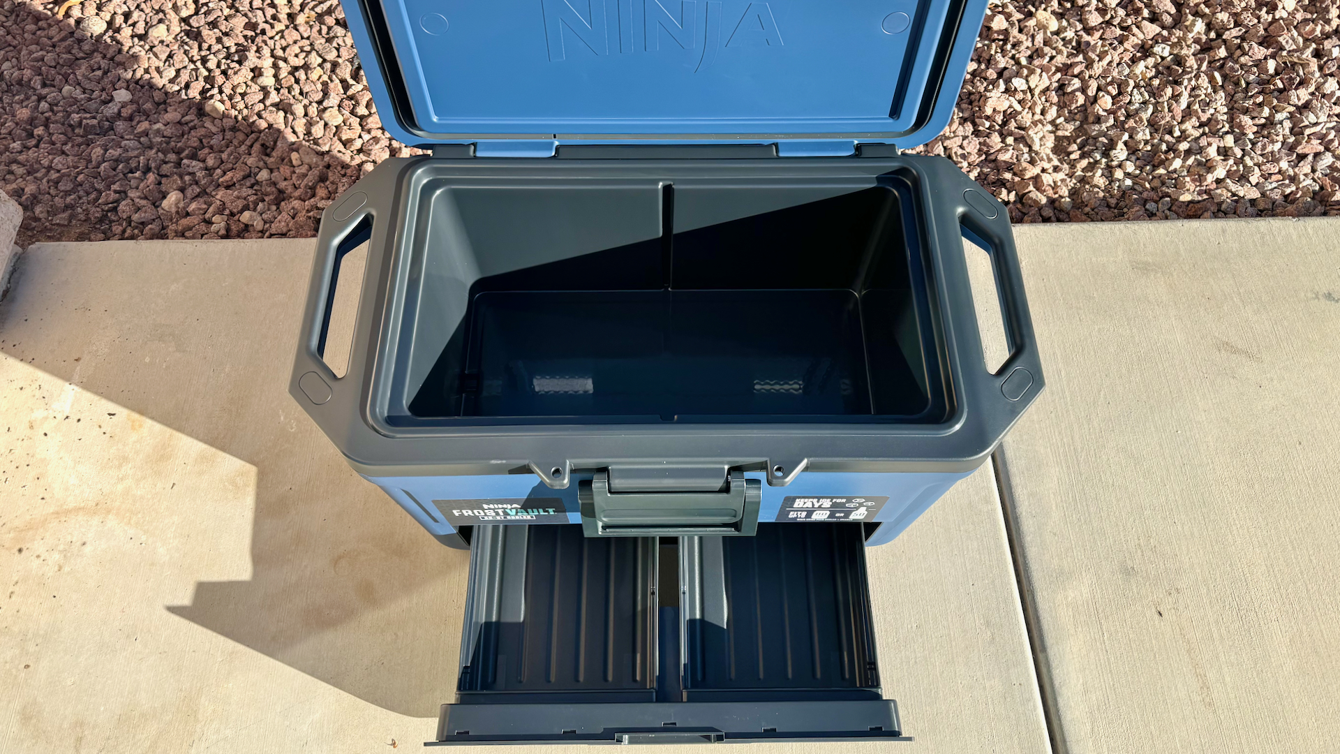 The video production team at one of my old employers had a special-ordered hard-sided cooler that would literally fit a human body; now that was a big cooler. I bring this up because a few people who have seen the Ninja have commented that, “it’s huge.” It’s 32 inches across, 19 inches tall, and 17 inches deep. That’s on the outside. Inside the main compartment, it’s 22 inches, by 12 inches, by 10 inches. Sitting below that is the dry storage, also cold, that measures, 22 inches, by 10 inches, by 3 inches. The bottom drawer has two baskets so you can keep food separated.