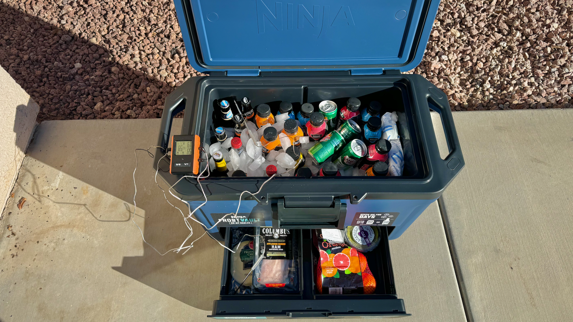 To test the cooler, I did load it up and take out to the RC flying field on a particularly hot day. And yes, it worked great and my drinks were ice cold all day. If you’re buying a cooler like this, you aren’t looking for hours of insulation, you’re after days. So, I set it up in my backyard, loaded it with food and drinks, instrumented it up, and recorded real data.