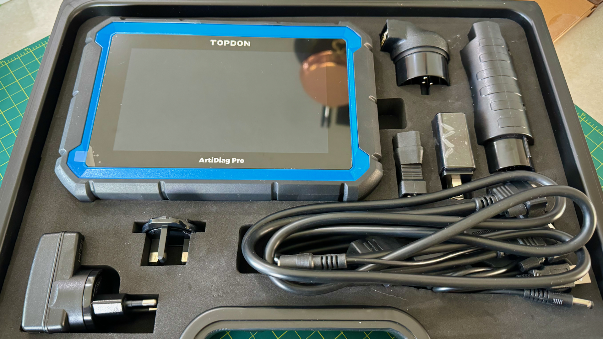 The unit is fairly large, roughly 9 x 6 x 1.5 inches and weighs nearly 2 pounds. The carrying case, however, is the size of a small briefcase. It holds the cables that work with multiple different car brands, the OBD2 plug, a charger, and the whole thing is foam-lined and I’d be lying if I said I don’t feel like I’m the tech geek in a heist movie every time I open it up. “Don’t worry Charlie, I’ll have this electronic lock cracked in three minutes.”