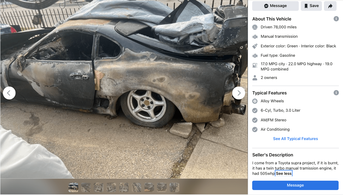 Now back in reality, before we (rightfully) tear this absolutely asinine listing apart, we’ve got to give the MKIV Toyota Supra its due. It’s a twin-turbo, rear-wheel drive coupe, with the legendary 2JZ engine that’s well known for its ability to handle modification. The first The Fast and the Furious movie catapulted the Supra MKIV into mainstream pop culture and solidified its fame among tuner car platforms. In the movie, Dominic Toretto (Vin Diesel) and Brian O’ Connor (Paul Walker) restore a ratty MKIV Supra, into the movie’s main hero car. The MKIV’s legend has only swelled, and people are selling them for prices well into six figures. That same wave of surging prices has apparently even given at least one owner the audacity to ask $12,000 for a vaguely Supra-shaped pile of ashes.