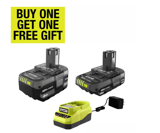 - Ryobi ONE+ 18V Lithium-Ion Starter Kit with 2.0 Ah Battery, 4.0 Ah Battery, and Charger for $99.00 Plus Free Tool or Battery