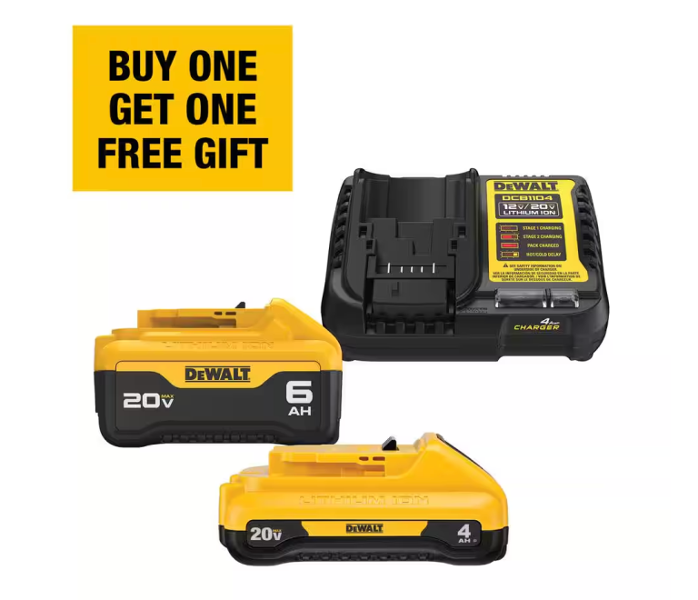 - DeWalt 20V MAX Lithium-Ion 6.0Ah and 4.0Ah Battery and Charger Starter Kit for $199.00 Plus Free Tool or Battery