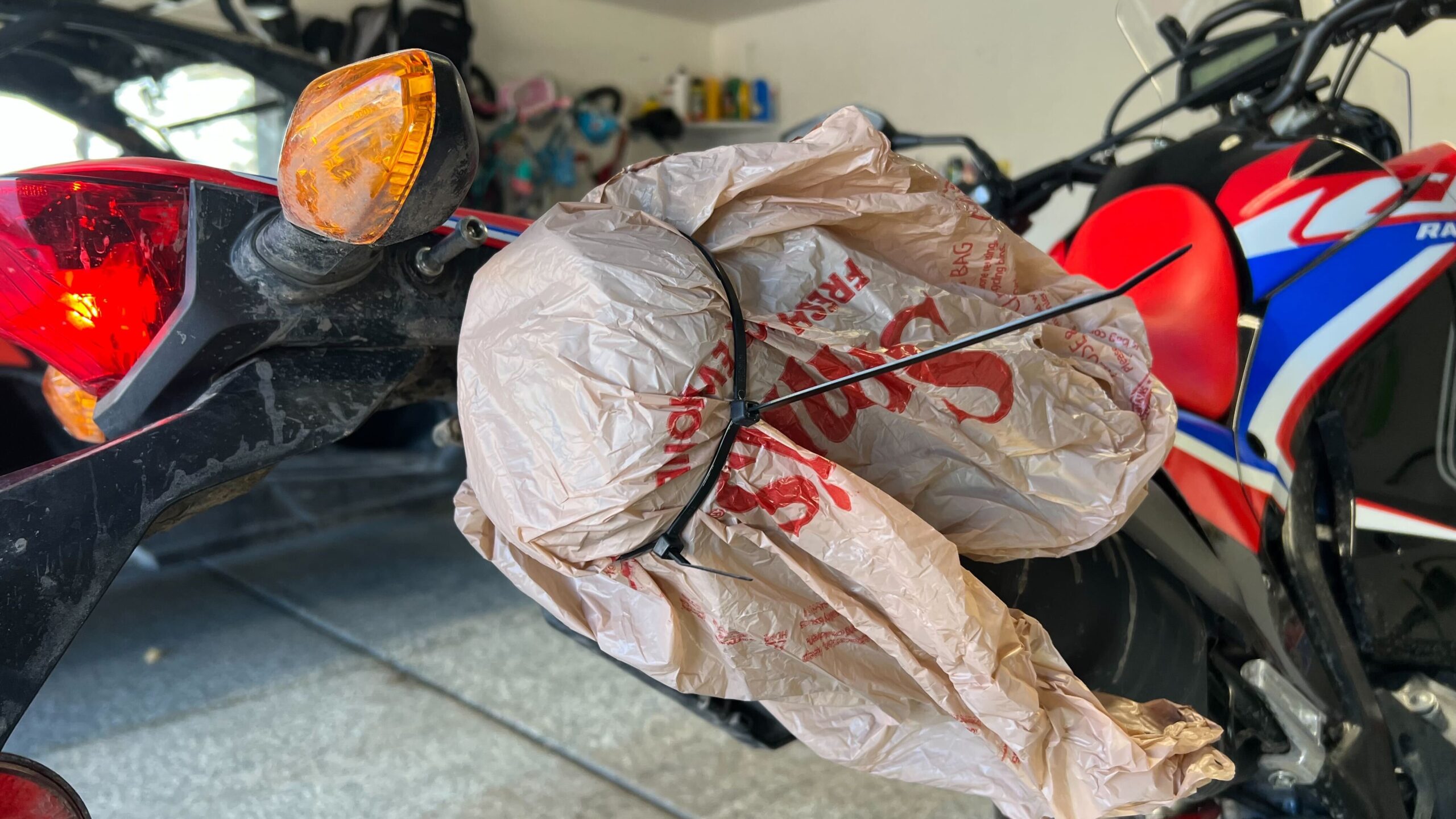 This step isn’t a necessity, but everything helps when preparing your motorcycle for its winter nap. Place a plastic bag around your bike’s airbox and another around its exhaust and secure them with elastic bands. Alternatively, you could plug your exhaust. This will stop moisture from creeping into these exposed areas. It’ll also prevent rodents from getting into your exhaust.