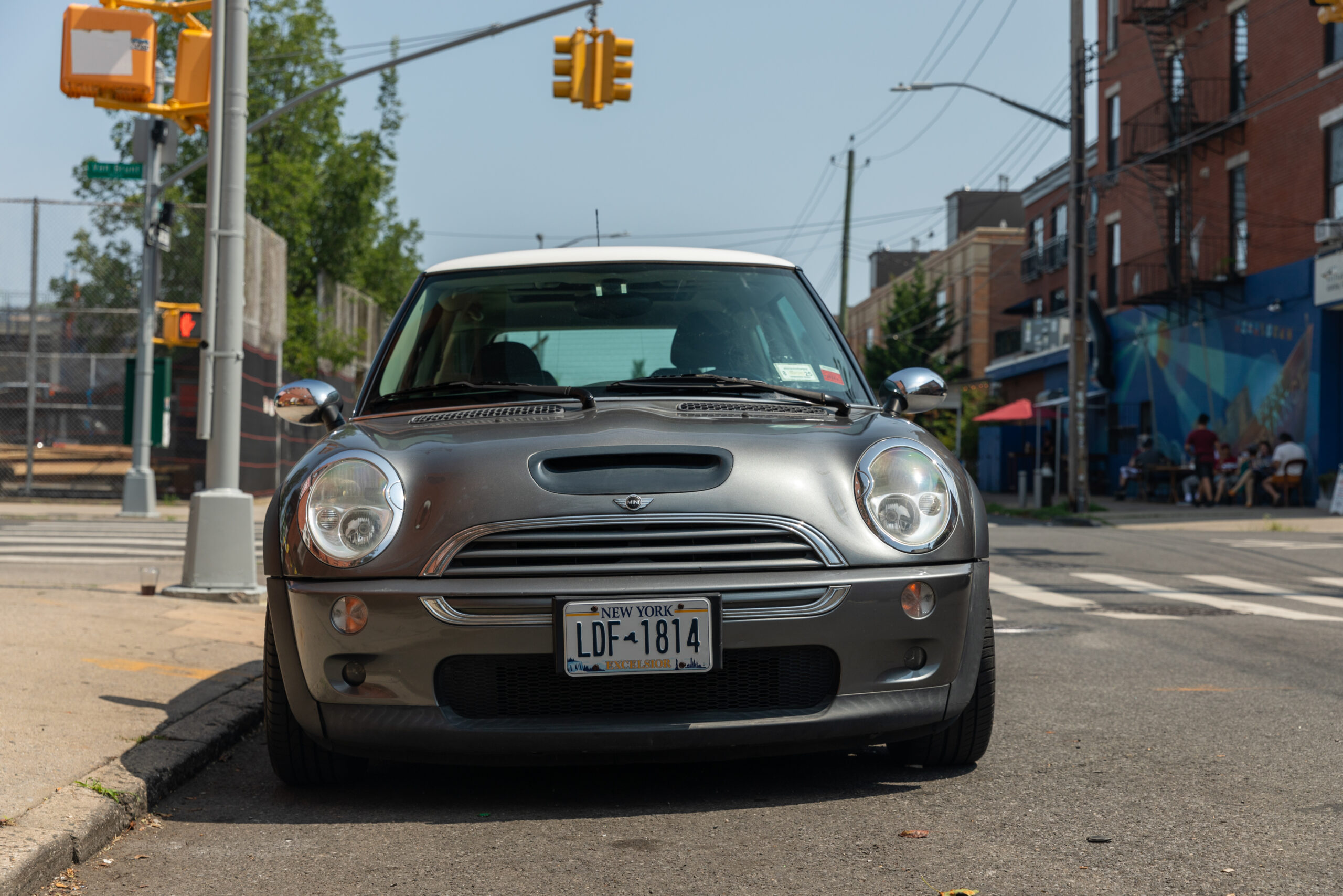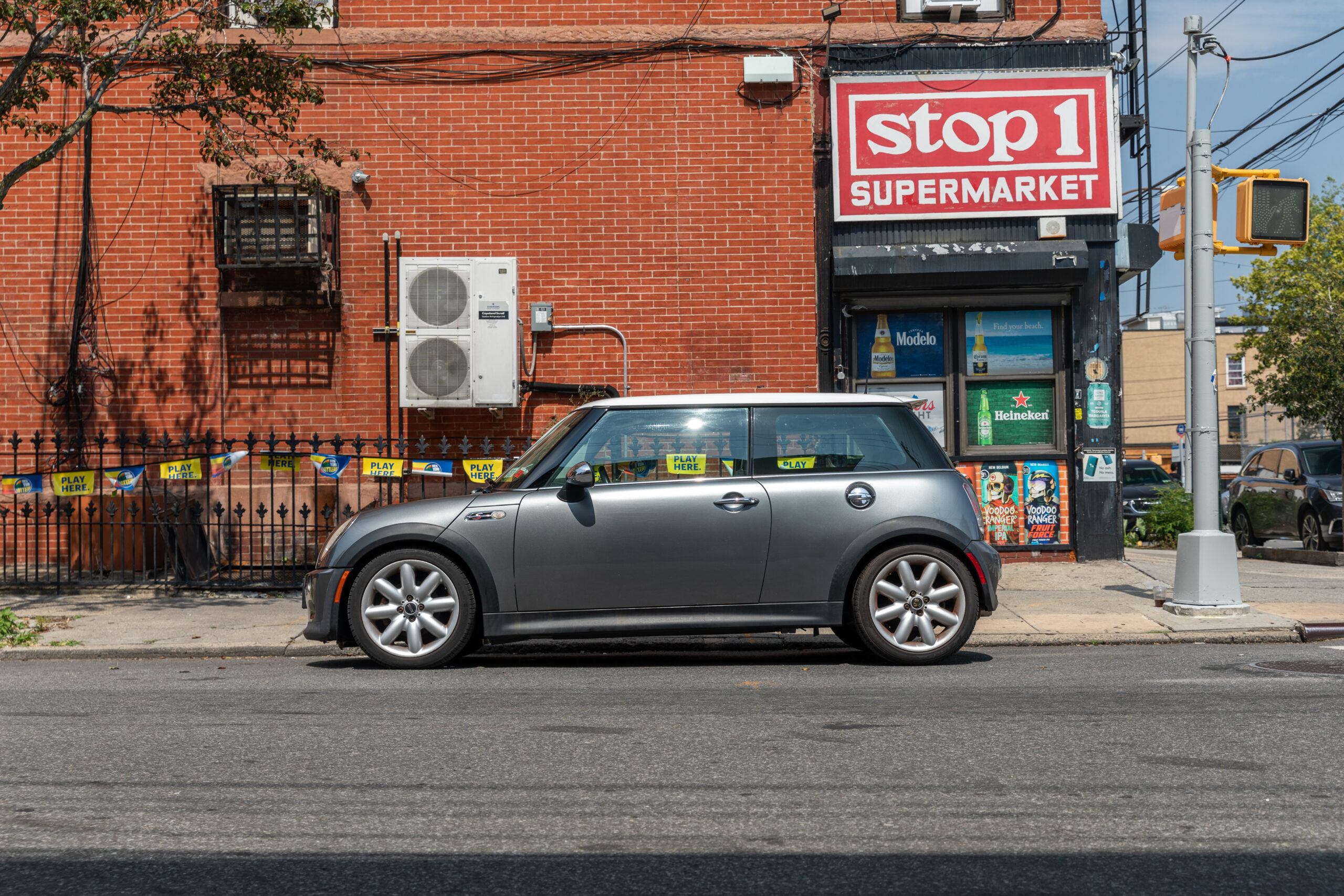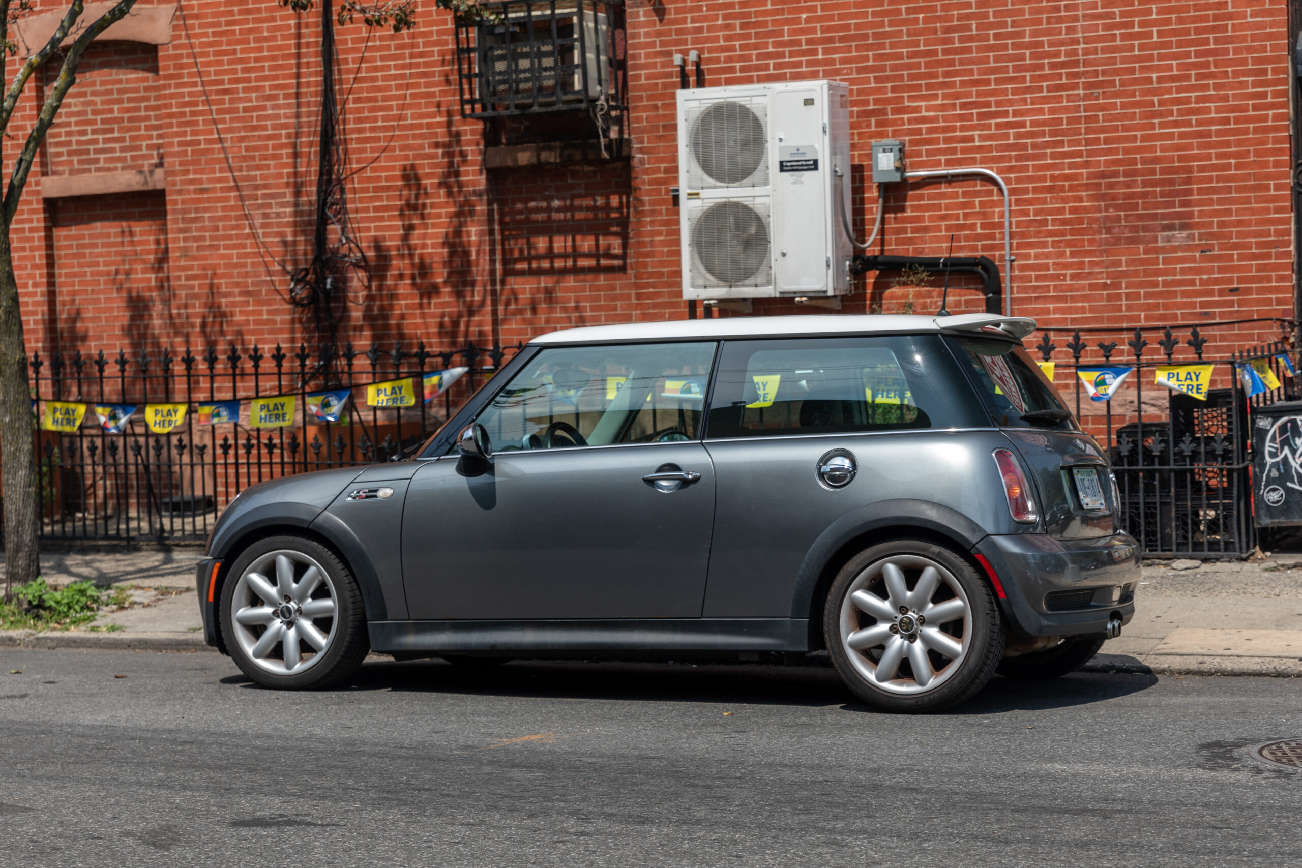 Dark gray with a white roof and two tone black/blue interior, there it was, with a phone number displayed in the curb-facing window. “Not today,” I thought, as I lingered on the street corner. A month passed. I checked on the Mini during my morning runs, tracking its progress across the street and back again. Little clues like its beat-up Empire State license plate hinted that it might still be with its original owner. Its stock exterior and the presence of a child seat suggested that person was also a responsible adult.